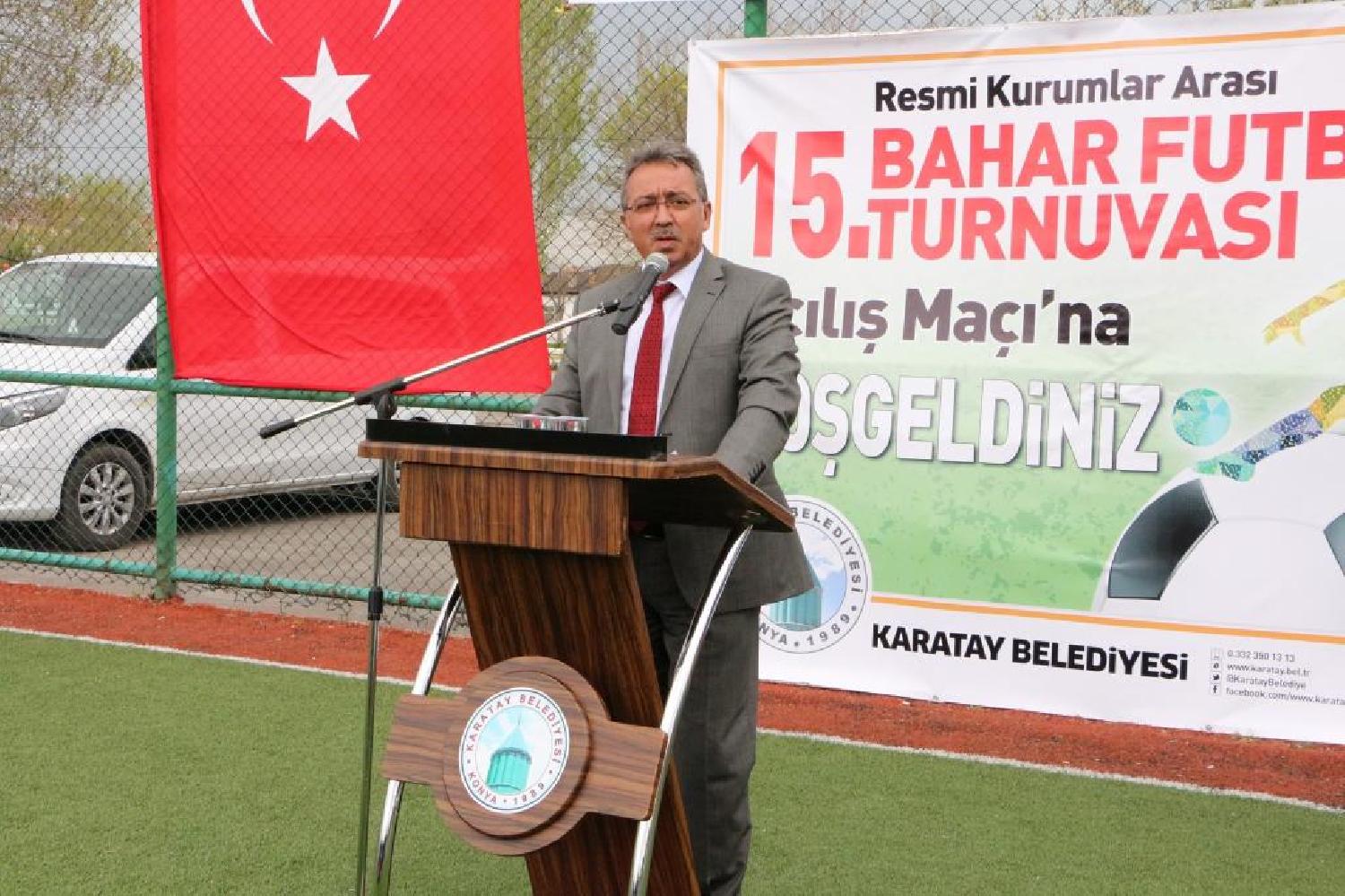 Bu yıl 15.'si düzenlenen ve resmi kurumların temsilcilerinin katıldığı bahar turnuvası açılış töreninde Karatay Belediye Başkanı Mehmet Hançerli, tertip edilen Resmi Kurumlar Arası Bahar Futbol Turnuvasının hayırlı olmasını diledi. Niyetlerinin kamu kurum ve kuruluşları arasındaki muhabbet, dostluk ve kardeşliği arttırmak olduğunu dile getiren Hançerli, turnuvada alınacak en önemli kupanın centilmenlik kupası olduğunu ifade etti. Mehmet Hançerli; bu yıl oluşturulan tertip komitesinin kararlarına belediye olarak harfiyen uyduklarını kaydederek her yıl müracaat sayısının arttığını ve bu yıl Kurumlardan 42 takımın katıldığını belirtti. Başkan Mehmet Hançerli; 10 gurupta yaklaşık 600 sporcunun karşılaşacağı müsabakalarda tüm takımlara başarılar diledi. Karatay Belediye Başkanı Mehmet Hançerli' nin ardından söz alan Karatay Kaymakamı Mustafa Altıntaş; turnuvaların dostluk, centilmenlik ve fair play ruhuna yakışır şekilde geçmesi temennileri ile emeği geçen herkese teşekkürlerini iletti. Son olarak söz alan Vali Yardımcısı Fazlı Akgün; oynanan müsabakalardaki temel amacın spor yapmaktan ileri olduğunu ve profesyonel liglerde karşılaşılan üzücü tabloların amatör müsabakalarda dostluk ve centilmenlik çerçevesinde özlenilen tabloda geçmesini görmek olduğunu dile getirdi ve takımlara başarılar diledi.