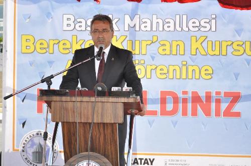 Başak Mahallesi Bereket Kur'an Kursu bahçesinde düzenlenen açılış törenine Konya İl Müftüsü Prof. Dr. Ali Akpınar, Karatay Belediye Başkanı Mehmet Hançerli, Selçuklu Belediye Başkan Vekili Faruk Ulular, Karatay İlçe Müftüsü Hasan Hüseyin Arslantürk, Selçuklu Müftüsü Ali Okutan, Ak Parti Karatay İlçe Teşkilatı, Hayırsever İş Adamı Ferit Baktemur, dernek yöneticileri ve çok sayıda davetli katıldı. Törenin açılış konuşmasını yapan Başak Mahallesi Muhtarı Asker Çetin, Kur’an Kursunun yapımında emeği geçen herkese teşekkür ederek; kursun hayırlara vesile olmasını diledi. Ardından söz alan Hayırsever İş Adamı Ferit Baktemur, Başak Mahallesi’nde Kur’an Kursu ihtiyacı olduğunu ve Karatay Belediyesi’nin kuran kursu yapılması için 4735 m2 yer tahsis ettiğini belirterek; “Bir yıl içinde Karatay Belediyesinin katkısı ile bu kursu tamamlayabildik. 350-400 öğrenci kapasiteli Bereket Kursu, Konyamıza ve Başak Mahallemize bereket getirmesini dilerim”dedi. Baktemur’un ardından söz alan Karatay İlçe Müftüsü Hasan Hüseyin Arslantürk ilçemizde müstakil olarak inşaatı devam eden 4 kursumuz da inşallah bu yıl bitirilerek hizmete açılacağını belirtti. Arslantürk, “dernek başkanlarımız ve hayırseverlerimiz bir ibadet aşkı ile çalışıyorlar. Bu tür binaların yapılmasında bahçe duvarlarının ve çevre düzenlemesinin yapılması hususunda da Karatay Belediyesi’ne çok teşekkür ediyorum.”dedi. Karatay Belediye Başkanı Mehmet Hançerli “yeni kanunla şehir merkezinde olan her şeyin bütün mahallelerimizde olması hedefleniyor. Bize düşen Başak Mahallemizi beton asfaltla buluşturmak. Her Kur’an Kursu inşasının 1 katını Karatay Belediyesi yapar ama Hayırsever İşadamı Ferit Baktemur bize iş bırakmadı ve tamamını yaptı. Bizde Karatay Belediyesi olarak bahçe düzenlemesi bahçeye kamelyalar bahçe duvarlarına ferforje bahçe duvar demirleri ve Kuran Kursunun yakınında bulunan Pazar yerini Kapalı Pazar Market haline getirelim. Devlet 4735m2 arsasını vermiş, belediye düzenlemesini tefrişatını yapmış. Önemli olan Merkezi Hükümetin desteğidir. Bizlerde onların verdiği desteğe layık çalışmalar yapmaya gayret ediyoruz” dedi. Karatay Belediye Başkanı Mehmet Hançerli’ nin ardından söz alan Konya İl Müftüsü Prof. Dr. Ali Akpınar Kuran kurslarımız hem devletimizin hem de hayırseverlerimizin çalışmaları ile hizmete giriyor ve bu kurslarda Kuran eğitimi alan gençlerimiz ülkemizin geleceği için hayırlı nesiller olarak yetişiyor. Artık Kuran okumayı öğrenemedim diye bir mazeret kalmadı. Güzel ülkemizin her köşesi kuran öğrenmek için kurslarla bezendi. Tüm insanlığın yararına çalışacak gençlerin yetişeceği bu kursların önemi çok büyüktür. Peygamberimiz “Ya öğreten ol ya öğrenen ol ya dinleyen ol ya da bunları seven ve destekleyen ol beşincisi olma helak olursun” ve “Allah katında en hayırlınız Kuranı öğrenen ve öğretendir” buyuruyor.”dedi. Konya İl Müftüsü Prof. Dr. Ali Akpınar Bereket Kur’an Kursu’nun yapımında emeği geçen herkese çok teşekkür ederek hayırlı olmasını diledi.