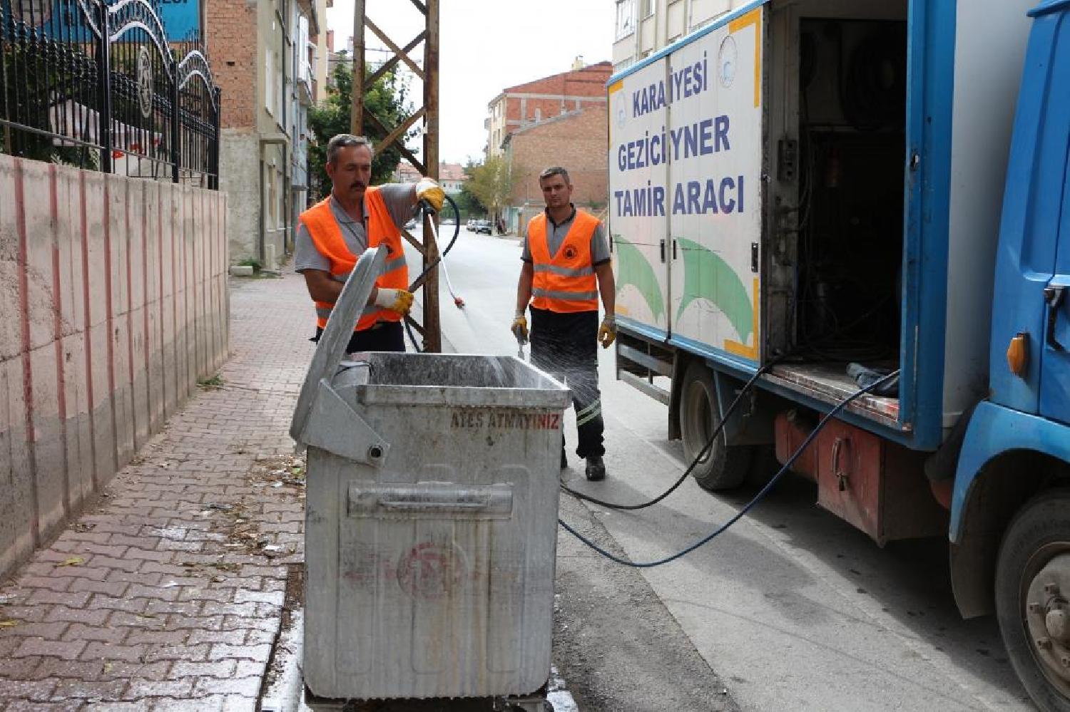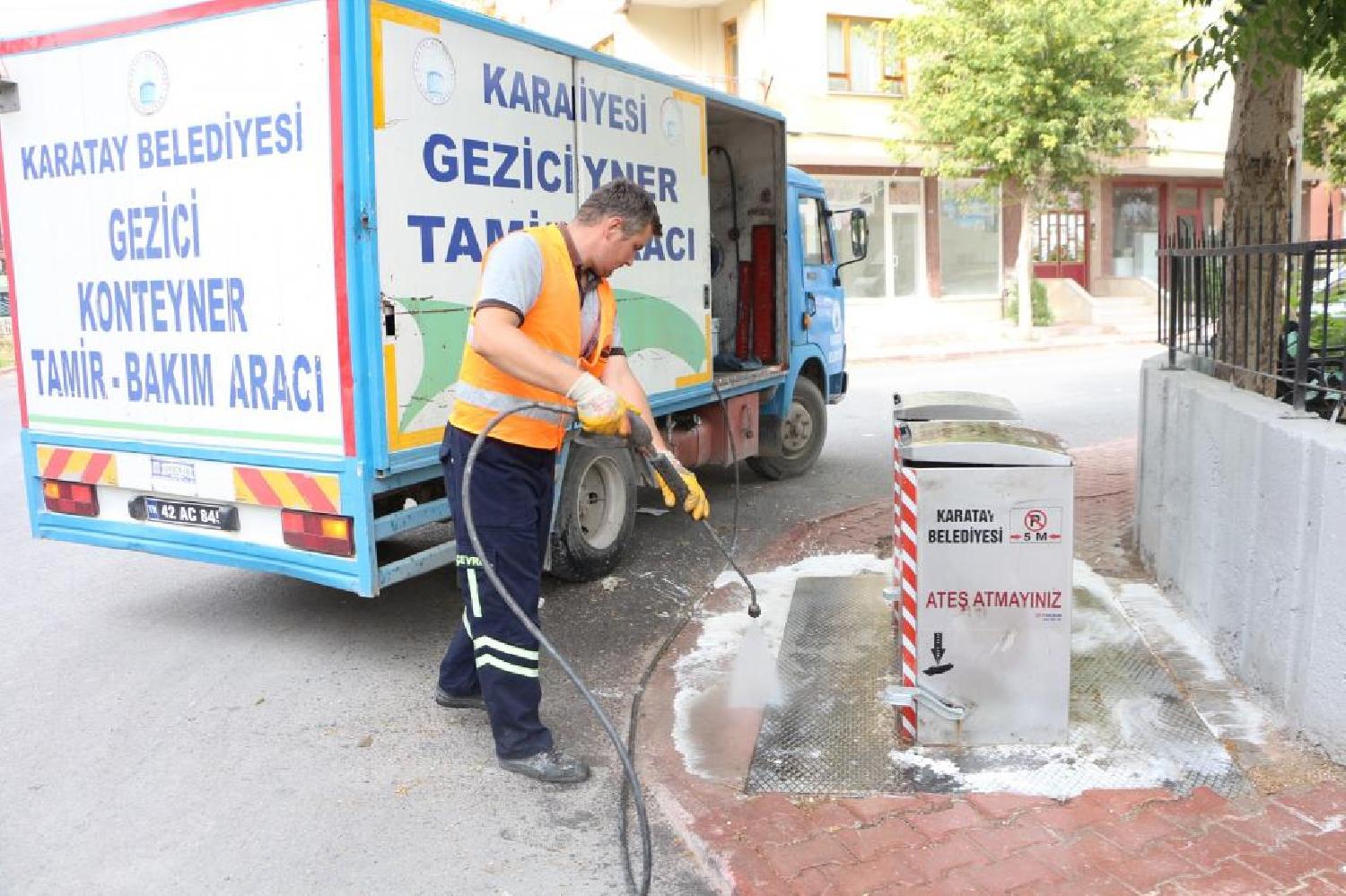 İlçe genelinde bulunan tüm çöp konteynırlarının yıkama ve dezenfekte işlemini yerinde yapan Karatay Belediyesi, halkın sağlığını ön planda tutuyor.