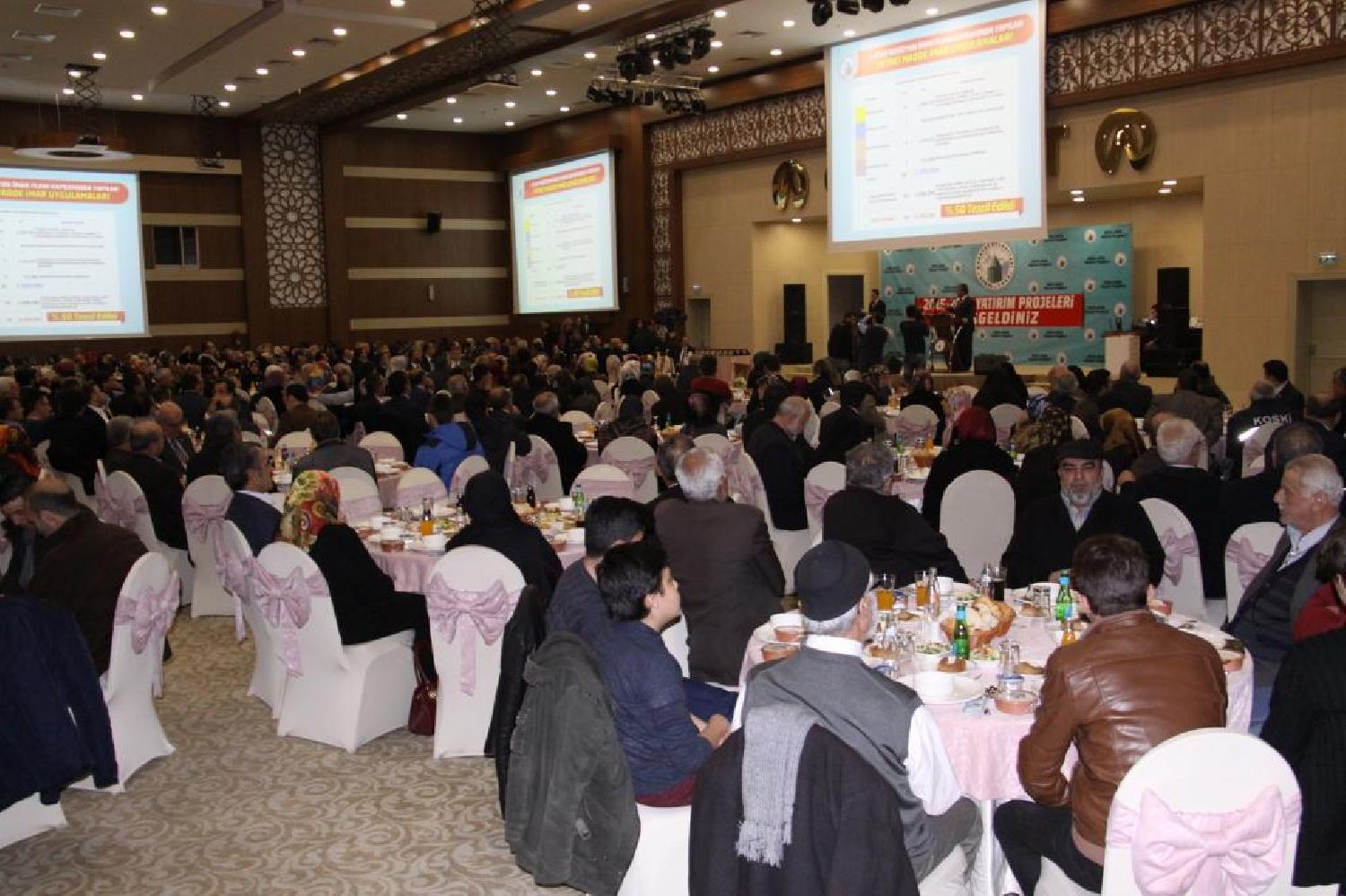 Ardından 2015 yılı yatırım programı ve 2016 yılı projelerini anlatan Karatay Belediye Başkanı Mehmet Hançerli, 3 dönemdir AK Parti İlçe Teşkilatı ve mahalle muhtarları ile birlikte bu vazifeyi icra ettiklerini belirterek Karatay'a güzel şeyler yapmanın gayreti içerisinde olduklarını vurguladı. Slayt eşliğinde belediye faaliyetlerini anlatan Hançerli, 11.261.000 m² lik alanda Revizyon İmar Planı yaptıklarını belirterek bu çalışmanın sonucunda önümüzdeki yıllarda Karatay ilçesine 125 Bin ilave nüfus geleceğini söyledi. Karatay'ın en büyük parkı olan ve 343 Bin 300 m² lik Şehir parkının tamamlanmak üzere olduğunu kaydeden Hançerli 2016 yılında parkın hizmet vereceğini dile getirdi. Yeni Büyükşehir yasasını en iyi uygulayan belediyelerden biri olduklarının altını çizen Başkan Hançerli, yayla yolları dahil yeni bağlanan mahallelere 625 Bin 385 m² satıh kaplama çalışması gerçekleştirdiklerini belirterek mahalle muhtarlarına 2016 yılı satıh kaplama programının hazır olduğu müjdesini verdi. Alzheimer Gündüz Yaşam Merkezi, Selim Sultan, Fevzi Çakmak, Altınekin, Göçü ve Karakaya Düğün salonları hakkında da bilgi veren Hançerli, Fetihkent Hanımlar lokali inşaatının devam ettiğini 2016 yılı içerisinde tamamlanacağını söyledi. Pazar Marketlere değinen Başkan Hançerli İsmil, Ovakavağı, Hayıroğlu ve Başak mahallesi Pazar Marketlerinin tamamlandığını belirterek Yarma mahallesi pazar market alanının kamulaştırmasının yapıldığını 2016 yılı içerisinde yapımına başlanarak tamamlanacağını vurguladı. Hançerli, Ferit Paşa ilkokulu bitişiğinde yapımı devam eden Çelebi camisinde de çalışmaların devam ettiğini, tamamlandığında mimarisiyle farklı bir görsellik katan caminin 1100 cemaatlik olduğunu dile getirdi.