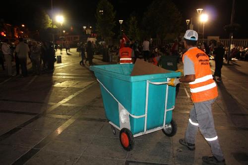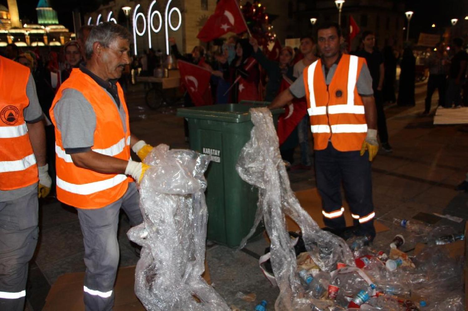 Konuyla ilgili bir açıklama yapan Karatay Belediye Başkanı Mehmet Hançerli, 15 Temmuz akşamı yaşanan darbe girişiminin ardından meydanlarda demokrasi nöbeti tutulmaya başlanırken nöbet öncesi ve sonrasında vatandaşlarımızın rahat etmesi için temizlik çalışmalarının aksatılmadan yürütüldüğünü söyledi. Meydanı akşam saatlerinden itibaren dolduran vatandaşların darbe girişimine karşı tepkilerini dile getirdiğini kaydeden Hançerli, belediye personelinin ise hem nöbet esnasında hem de gecenin geç saatlerine kadar devam eden nöbet sonrasında temizlik faaliyetlerini sürdürdüğünü vurguladı. Yapılan temizlik faaliyetlerinin sadece Mevlana Meydanı ile sınırlı olmadığını belirten Başkan Hançerli, Topraklık, Kışla, Şehit Nazımbey ve Mevlana caddelerinde de sabahın erken saatlerinde çalışmaların devam ettiğini kaydetti. 15 Temmuz darbe girişimine karşı Konyalıların ve tüm Türkiye'nin tek ses ve tek yumruk olduğunu vurgulayan Başkan Mehmet Hançerli, "Sayın Cumhurbaşkanımızın belirlediği tarihe kadar meydanlardan ayrılmayacağız" dedi.