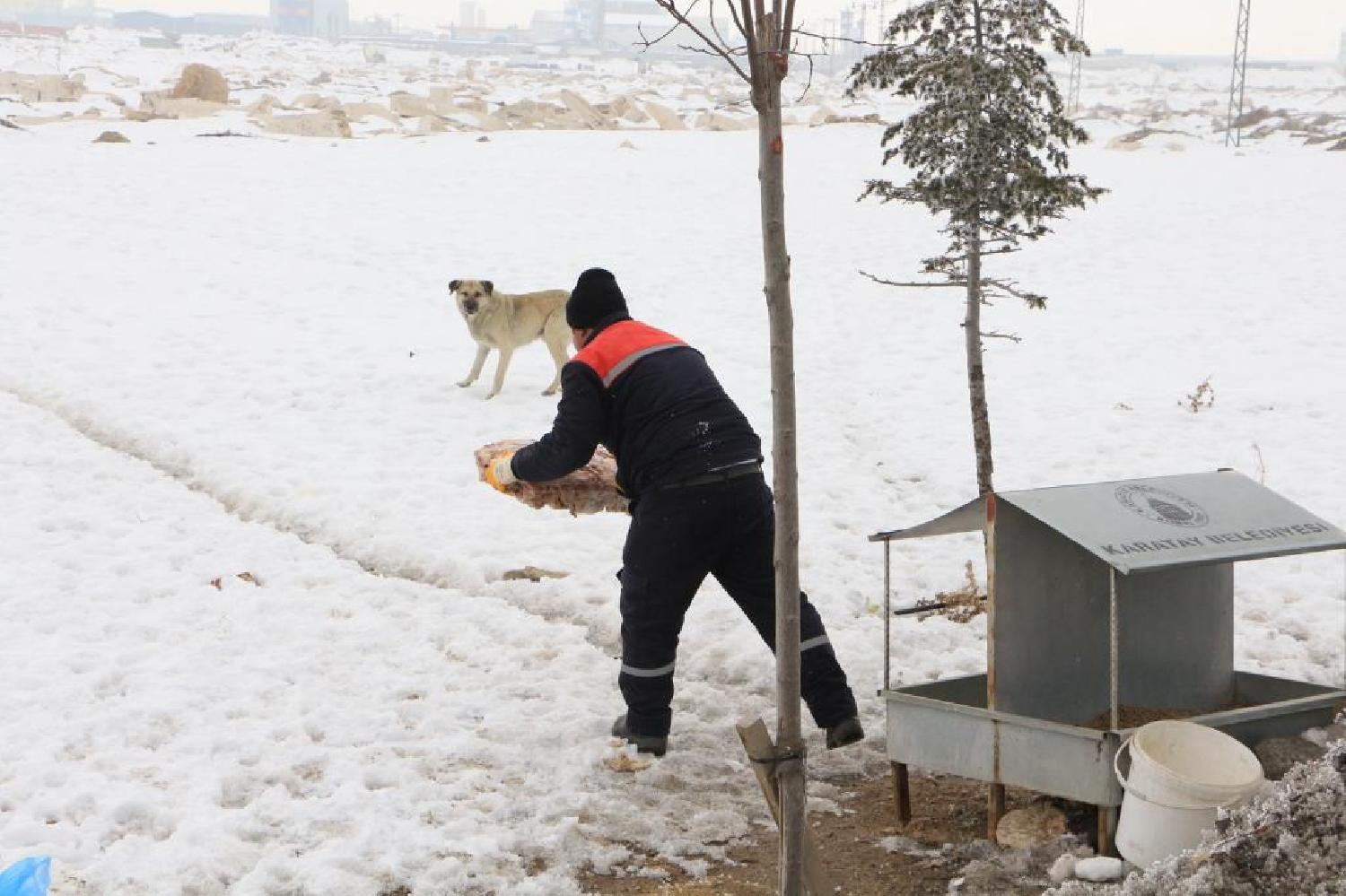 Karatay Belediyesi tarafından sokak hayvanları için ilçedeki hayvan beslenme noktalarına ve doğaya yem bırakıldı