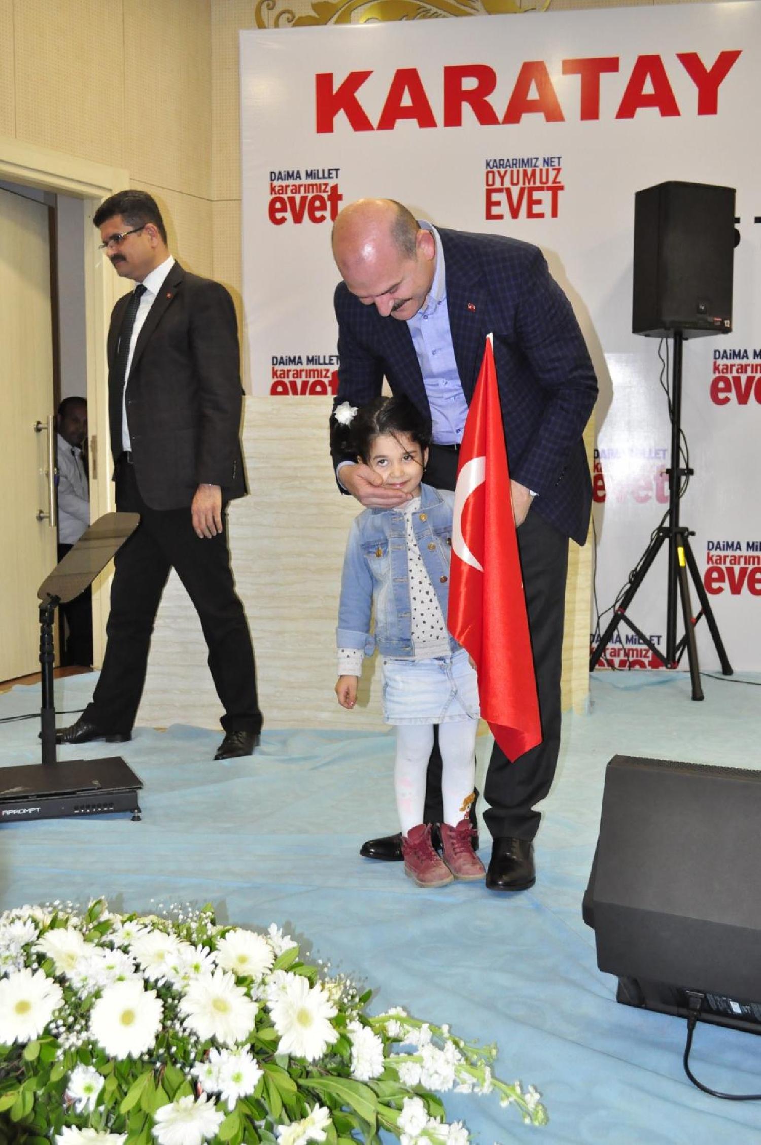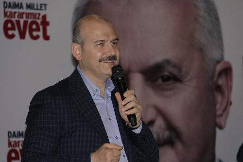 16 Nisan'ın sadece bir referandum olmadığına dikkat çeken Bakan Süleyman Soylu; "16 Nisan sadece 18 maddelik bir referandum değildir. 16 Nisan omzunda büyük bir yük olan büyük medeniyetin yarına hasarsız taşımak zorunda olduğu bu büyük medeniyetin, büyük anlayışın kendisinin üzerine oynanan bütün oyunlarına yüksek sesle artık bizi terbiye edemeyeceksiniz diye ortaya koyduğu büyük bir itirazın adıdır. Kendisini 2023'e, 2051'e ve 2071'e hedeflemiş bir ülkeyiz. Hükümet beş yıllık bir karne koyacak milletin önüne ve diyecek ki 'Ben bunu yapacağım.' Meclis de bir taraftan yasayı, kanunu yapacak bir taraftan da milletle hükümet arasında önemli köprü işlevini yerine getirebilecek. Yargı da kendi işini yapacak. Şimdi karman çorman bir sistem var. Bırak kuvvetler ayrılığını. Kuvvetler karmaşasının olduğu bir sistem. Bir taraftan yargının meclise karıştığı, bir taraftan yargının hükümete tahakküm ettiği, eğer hükümet zayıfsa kukla gibi oynattığı, eğer mecliste başka bir sıkıntı varsa hükümetin meclisi istediği gibi yönettiği karman çorman bir sistem. Bu sistem baba ile oğlunu birbirine düşürür. Bu sistem kardeşi kardeşe düşürür" diye konuştu.