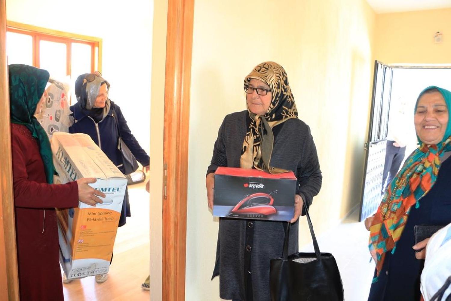 Karatay Belediyesi Başak Mahallesi'nde soba borusunun devrilmesi sonucu çıkan yangında evleri küle dönen Karataş ailesinin evini yaptırdıktan sonra eşya yardımında da bulundu.