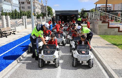 Çocuklar, akülü araçlarla trafik kurallarına uygun sürüş, durma, park etme, güvenli takip mesafesi, emniyet kemerinin önemi, trafik ışıklarında sürücü ve yaya davranışları gibi konularda eğitim alıyor. Ayrıca eğitimlerin ilk gününde öğrencilere çanta ve çeşitli hediyeler dağıtıldı.
