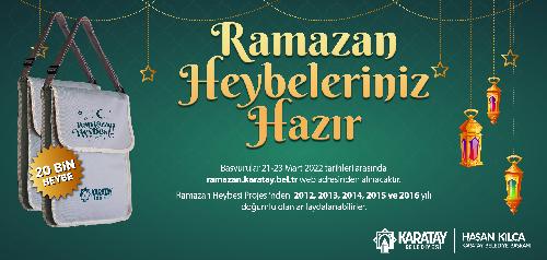 “Ramazan Heybeleriniz Hazır” projesi kapsamında Karatay Belediyesi, ramazan.karatay.bel.tr adresine kayıt yaptıran 2012, 2013, 2014, 2015 ve 2016 yılı doğumlu 20 bin Karataylı çocuğa “Ramazan Heybesi” hediye edecek.