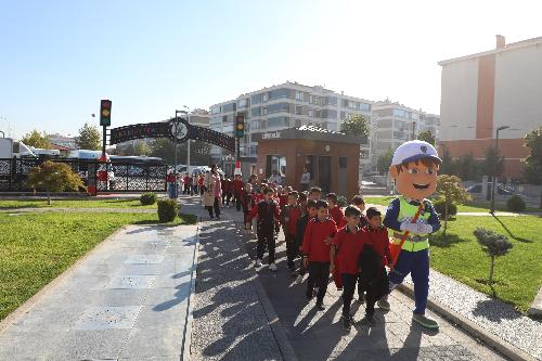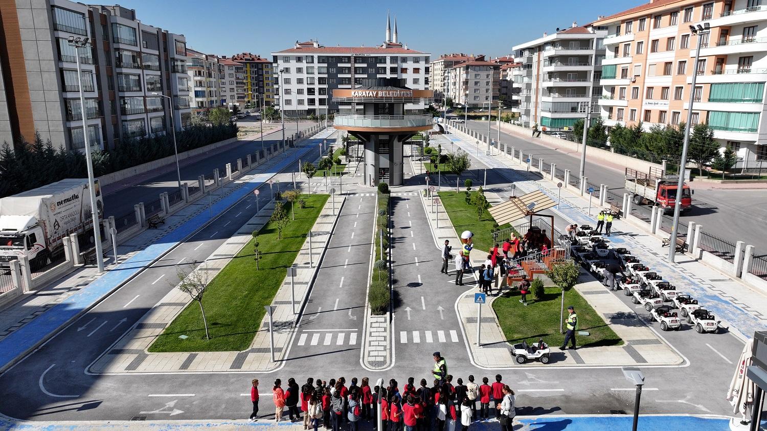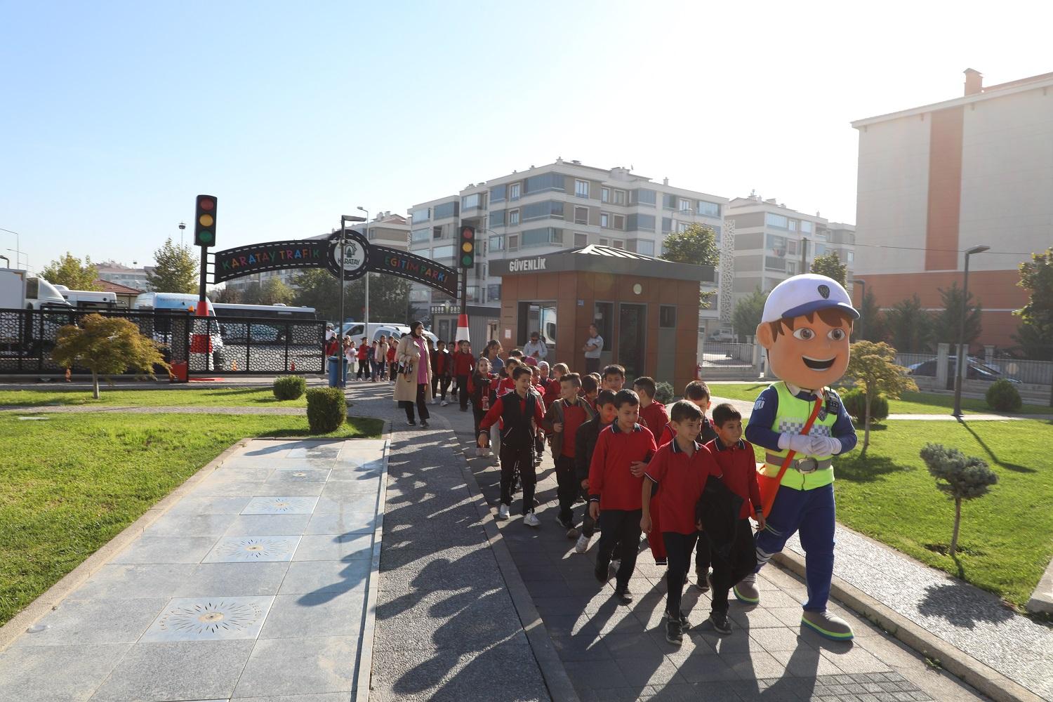 İlçe genelindeki 59 okuldan ilkokul 4’üncü sınıf öğrencilerine yönelik olarak yürütülen projeyle öğrenciler; Karatay Belediyesi tarafından tahsis edilen servis araçlarıyla Karatay Belediyesi’nin Ulubatlı Hasan Mahallesi’nde 8 bin 900 metrekarelik alanda inşa ettiği ve çocukların trafik kültürünü hem teorik hem de uygulamalı olarak öğrenebildiği Karatay Trafik Eğitim Parkı’na getiriliyor.