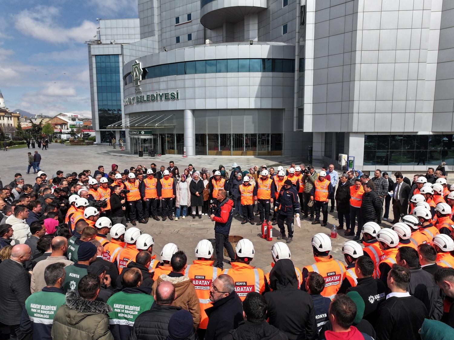 Karatay Belediyesi, Afet ve Acil Durum Yönetimi Başkanlığı (AFAD) Konya İl Müdürlüğü iş birliğiyle belediye personeline yönelik “Afet ve Yangın Farkındalık Eğitimi” düzenledi. Eğitimin teorik kısmının ardından yangın tatbikatı gerçekleştirildi.