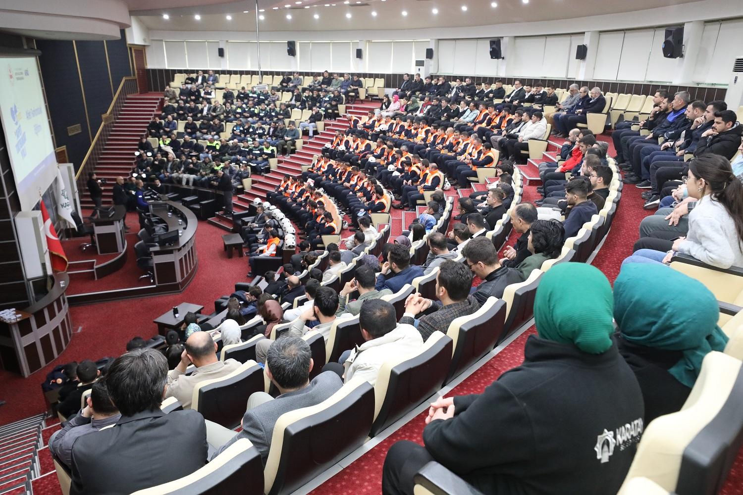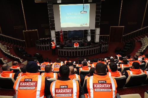 Belediye çalışanlarının afetlere karşı bilinçlenmesi ve olası acil durumlara hazırlıklı olması amacıyla gerçekleştirilen teorik eğitim, uygulamalı tatbikatlarla desteklendi. Eğitim, AFAD Arama Kurtarma Birim Şefi Serdar Gencer tarafından verildi. Eğitim kapsamında ilk olarak afet farkındalığı ve yangına müdahale konularında, Karatay Belediyesi Afet İşleri Müdürlüğü tarafından özel olarak kurulan arama kurtarma ekibine yönelik sunumlar gerçekleştirildi.