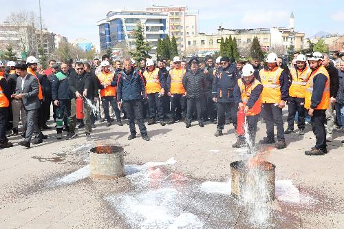 Sunumların ardından ise bir yangın tatbikatı düzenlendi. Tatbikat, personelin önceden bilgilendirilmediği bir senaryo üzerinden yürütüldü. Yangın sirenlerinin çalmasıyla başlayan tatbikatta, belediye binasındaki tüm çalışanlar acil çıkış noktalarını kullanarak tahliye edildi. Acil durum ekiplerinin koordineli çalışmasıyla tahliye işlemi, tüm personelin güvenli toplanma alanında bir araya getirilmesiyle başarıyla tamamlandı. Tahliyenin ardından belediye binası dışında yangın söndürme tatbikatı gerçekleştirildi. Yangın söndürme tüplerinin kullanımıyla ilgili bilgilendirilen personel, yangına müdahale pratiği yapma imkânı buldu.