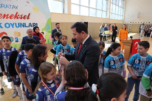 Karatay Cemil Keleşoğlu Spor Salonu’nda gerçekleştirilen “Geleneksel Çocuk Oyunları İlçe Finali ve Ödül Töreni” programına Karatay Belediye Başkanı Hasan Kılca, Karatay İlçe Milli Eğitim Müdürü Turan Kayacılar, okul müdürleri, öğretmenler ve öğrenciler katıldı.