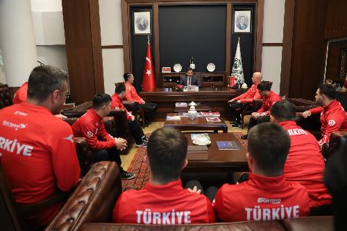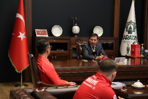 Ziyaretten duyduğu memnuniyeti dile getiren Başkan Hasan Kılca, “Tüm branşlarda spora yönelik önemli yatırımlar gerçekleştiriyoruz. Gençlerimizin fiziksel ve zihinsel gelişimlerine katkı sunmak amacıyla yoğun bir çaba içerisindeyiz. Antrenörlerimiz de bu süreçte büyük bir özveriyle görev yapmaktadır. Ben de geçmişte uzun yıllar futbol oynamış biri olarak, sergilediğiniz performansı takdirle izliyorum. Sizler, bizlerden çok daha ileri seviyede bir oyun ortaya koyuyorsunuz. Azminiz, enerjiniz ve mücadele ruhunuzla hepimize örnek oluyorsunuz. Göstermiş olduğunuz çaba, bizleri hem duygulandırıyor hem de gururlandırıyor. Ay-yıldızlı bayrağımızı göndere çekerek milletimize gurur yaşatıyor, bizleri onurlandırıyorsunuz. Bizler de Karatay Belediyesi olarak her zaman sporcularımızın yanında olmaya devam edeceğiz.” ifadelerini kullandı.