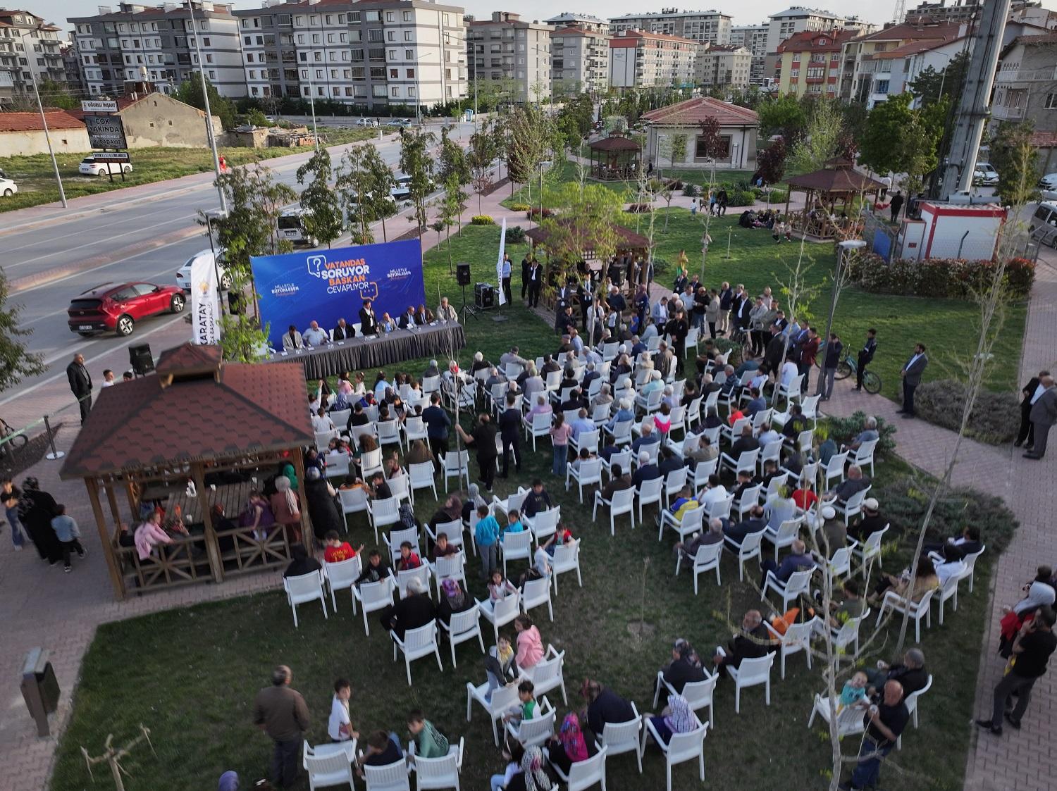 Karatay Belediye Başkanı Hasan Kılca, AK Parti Yerel Yönetimler Başkanlığı tarafından düzenlenen “Vatandaş Soruyor, Başkan Cevaplıyor” programı kapsamında vatandaşlarla bir araya geldi. Celalettin Karatay Parkı’nda gerçekleşen buluşmada Başkan Kılca, Mengene, Sarıyakup ve Aziziye Mahalle sakinlerinin sorularını yanıtladı; yapılan hizmetler ve projeler hakkında bilgi verdi.