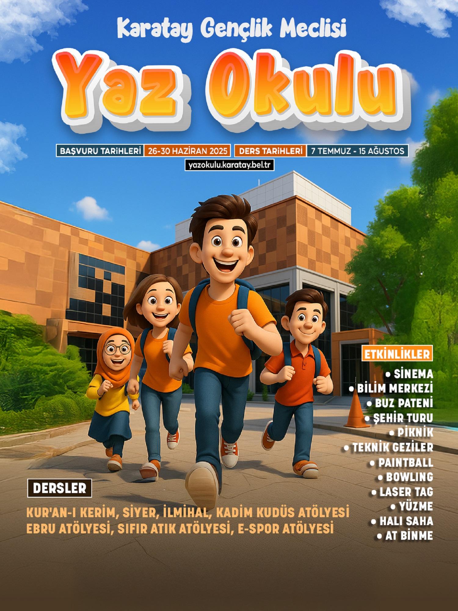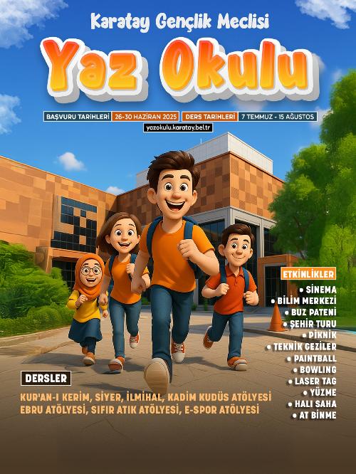 Bu yıl 5’incisi düzenlenen Karatay Gençlik Meclisi Yaz Okulu, Karatay İlçe Milli Eğitim Müdürlüğü iş birliğiyle lise düzeyindeki öğrencilere yönelik gerçekleştirilecek. Yaz Okulu’na katılmak isteyen öğrenciler, 26-30 Haziran 2025 tarihleri arasında başvuru yapabilecek. Eğitimler ise 7 Temmuz - 15 Ağustos 2025 tarihleri arasında gerçekleştirilecek. Başvuru ve detaylı bilgilere yazokulu.karatay.bel.tr adresinden ulaşılabilecek.