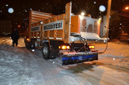 Konya'da aralıksız devam eden kar yağışının günlük hayatı olumsuz etkilememesi için Karatay Belediye'sinde kar temizliği gece-gündüz demeden sürüyor. Kar ve buzlanmaya karşı; kar küreme, tuzlama ve solüsyon çalışması yapan Karatay Belediyesi Fen İşleri Müdürlüğü ekipleri vatandaşların olumsuz etkilenmemesi için büyük çaba harcıyor. Ekipler çalışmalarına sadece gündüz değil gece de devam ediyor. Yoğun mesai harcayan karla mücadele ekipleri ilçe merkezi ve yeni bağlanan mahalle ve beldelerde yol açma çalışmalarını sürdürüyor. Konu ile ilgili açıklama yapan Karatay Belediye Başkanı Mehmet Hançerli, 'karla mücadele ekiplerimiz tuzlama ve solisyon çalışmalarına hız kesmeden devam ediyor. Biz öncelikli olarak vatandaşımızın huzurunu ve rahatını düşünüyoruz, gündelik işlerinde herhangi bir aksama olmaması için ekiplerimiz büyük bir özveri ile çalışıyor. Greyderlerimiz, kar bıçaklı kamyonlarımız, solisyonlu araçlarımız, tuzlama ekiplerimiz, kamyonlarımız hepsi karla mücadele etmeye hazır" diye konuştu. Öte yandan Karatay Belediyesi vatandaşların karla mücadelede whatsapp hattı ile gelen istek ve şikayetlerine anında cevap vererek yardımların ulaşmasını kolaylaştırıyor.