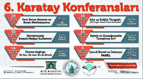 Doç.Dr Bülent Bingöl vereceği “Günümüzde Sosyal Medya Kullanımı” konulu konferans 30 Kasım Perşembe Günü Saat 10:00’da Karatay Belediyesi Meclis Salonunda, Yrd. Doç.Dr. Füsun Sunar’ın bayanlara özel vereceği “Üreme Sağlığı: Bir Sen, Bir Ben, Bir de Bebek” konulu konferans 14 Aralık Perşembe Günü Saat 10:00’da Karatay Belediyesi Meclis Salonunda, Psikolog Esra Çoşkun’un bayanlara özel vereceği “Aile ve Evlilik Terapisi: Çift Terapisi Altında İletişim Problemleri” konulu konferans 16 Ocak 2018 Salı Günü Saat 10:00’da Karatay Belediyesi Meclis Salonunda, 15 Şubat 2018 Perşembe Günü Saat 10:00’da Yrd.Doç.Dr Hatice Yalçın’ın vereceği “Eşiniz ve Çocuğunuzla Tanıştınız Mı?” konulu konferans Karatay Belediyesi Meclis Salonunda gerçekleşecek. Konferanslar 6 Mart 2018 Salı Günü Saat 10:00’da Prof. Dr. Kamil Alptekin, Yrd.Doç.Dr. Hatice Yalçın, Yrd.Doç.Dr. Seher Akdeniz tarafından Rehberlik Uzmanı Ali Bozgedik’in moderatörlüğünde KTO Karatay Üniversitesinde gerçekleştirilecek “Çocuk İhmal ve İstismarı” konulu panelle sona erecek.