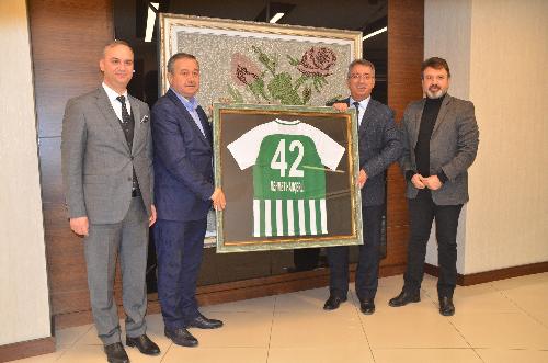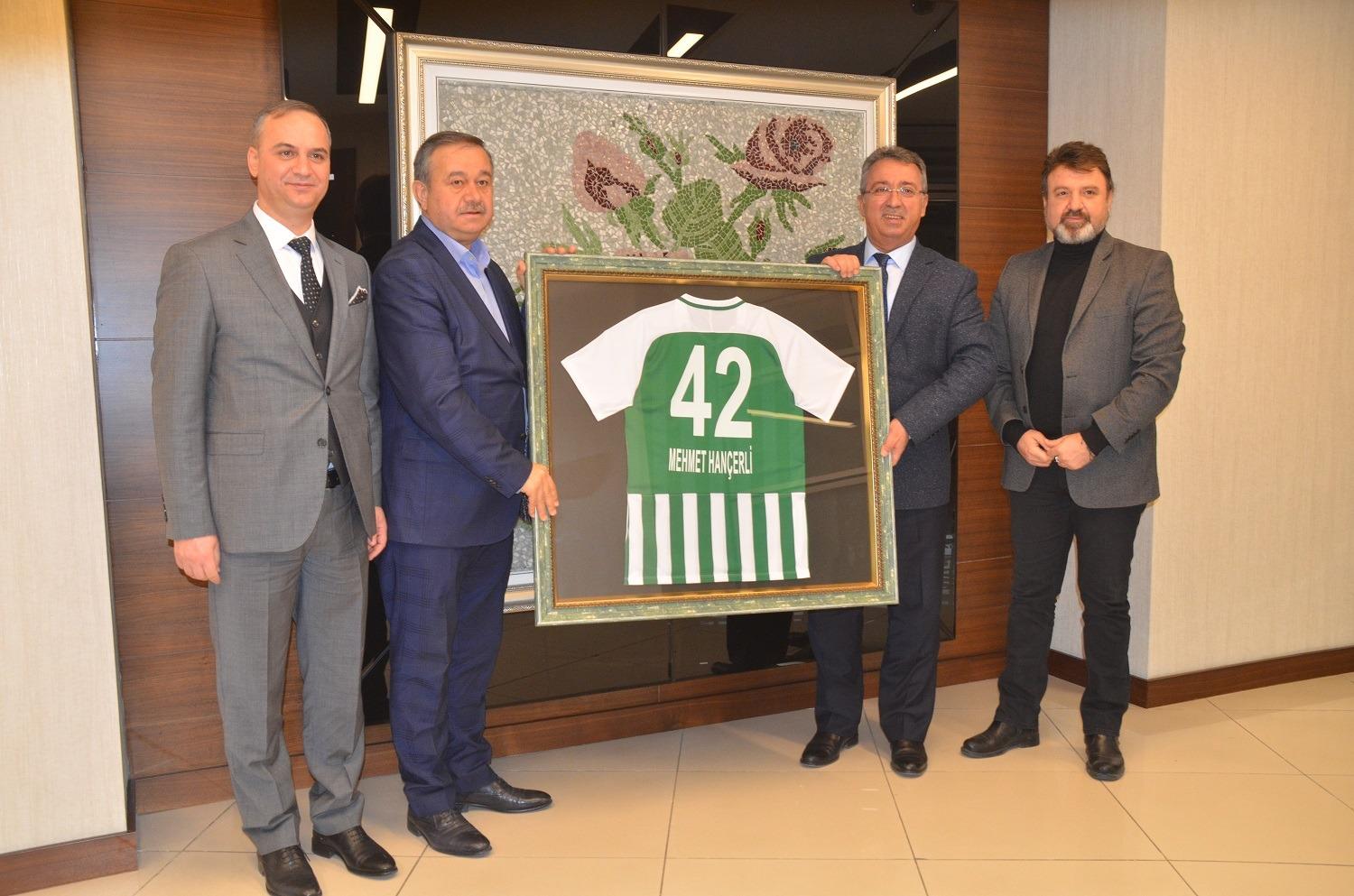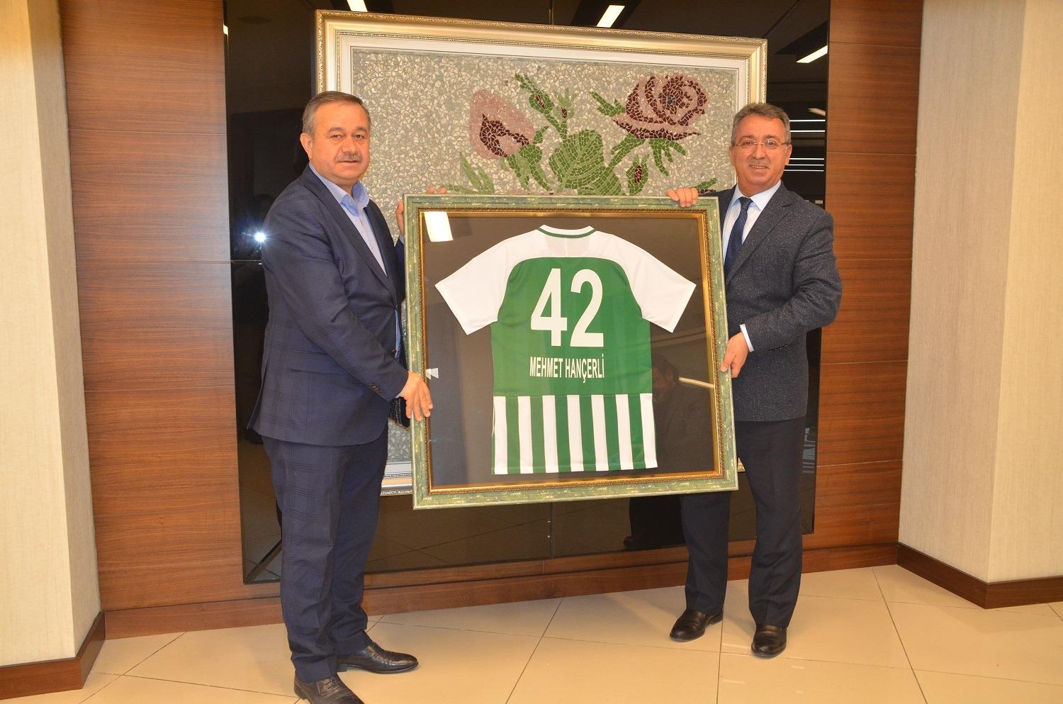 Konyaspor As Başkanı Mehmet Günbaş, Başkan Hançerli’ye isminin yazılı olduğu Konyaspor forması hediye etti.