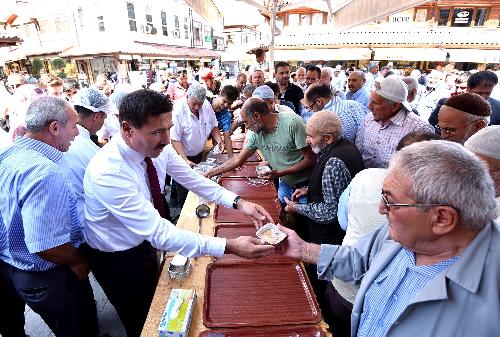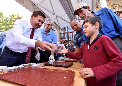Kazanın başına geçen Karatay Belediye Başkanı Hasan Kılca, kendi elleriyle hemşehrilerine Aşureyi ikram etti.