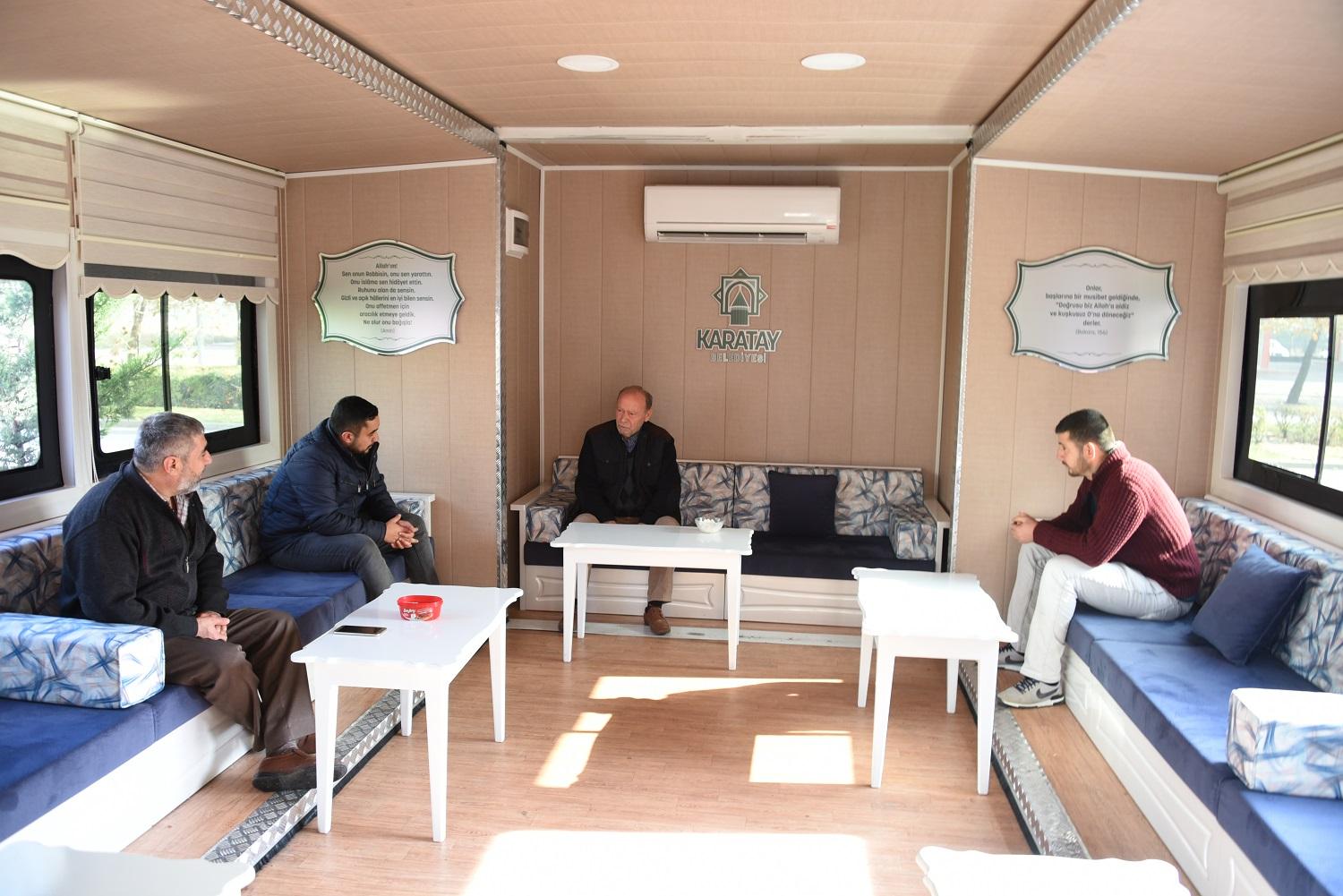 İklimlendirme sistemi sayesinde yazın serin, kışın sıcak olması sağlanan araçlarda; sohbet ve Kur’an-ı Kerim tilaveti için ses sistemi, saklama dolapları, su deposu, atık deposu ve tuvaletler bulunuyor. Mutfak bölümünün de bulunduğu mobil taziye araçlarında gelen vatandaşlara çay ve su ikramı da yapılabiliyor. Karataylılar, ihtiyaç duymaları durumda mobil taziye araçlarına 0538 047 37 60 İletişim Hattı’nın yanı sıra Karatay Belediyesi’nin 0 332 350 13 13 telefon numarasından ulaşabiliyor.