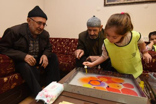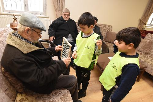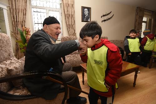 Ziyaretlere emekli konakları sakinlerinin tek tek ellerini öperek başlayan minikler, dedeleriyle birlikte hem ebru çalışması yaptı hem de ebru sanatı konusunda öğrendiklerini dedelerine anlattı.