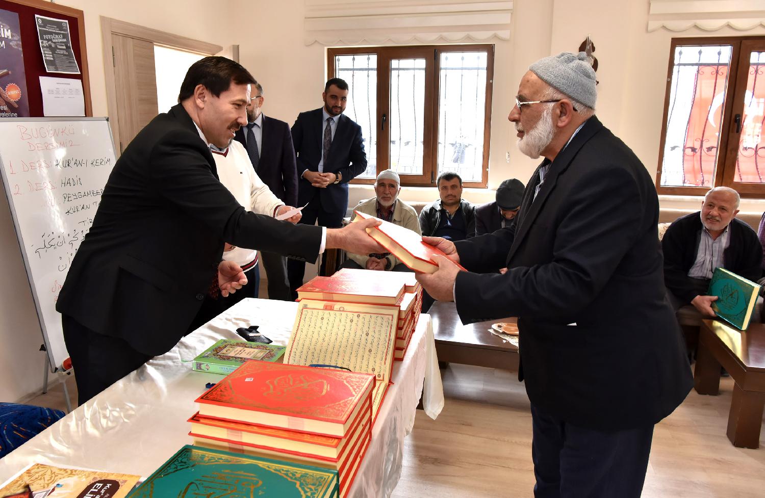 Karatay Belediye Başkanı Hasan Kılca, ziyaretinin sonunda 18 emekli konağında Kur’an-ı Kerim eğitimi alan vatandaşa 350 Kur’an-ı Kerim hediye etti.