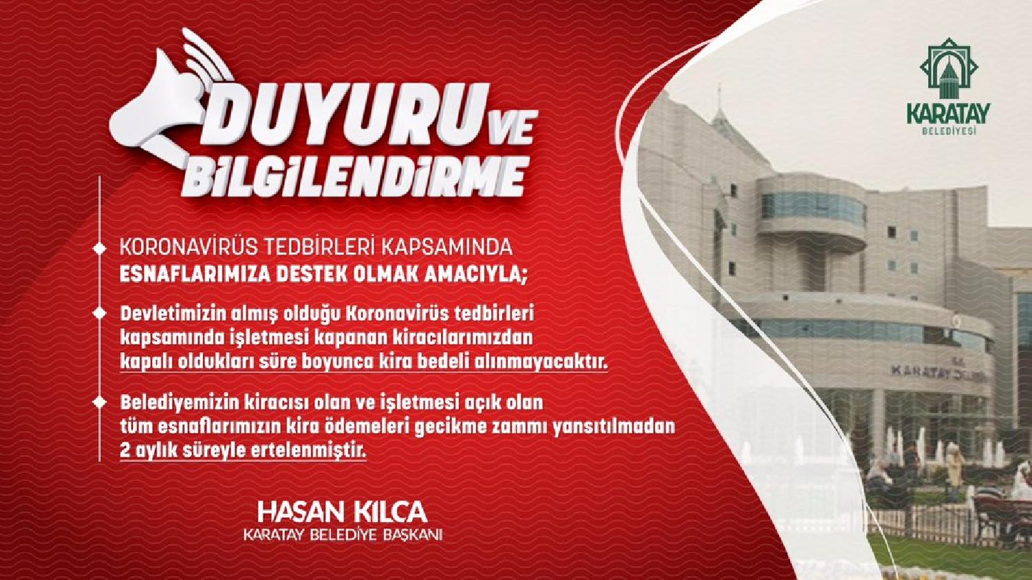 Karatay Belediyesi, yeni tip Koronavirüsle (Covid-19) mücadele kapsamında yeni kararlar ve tedbirler alarak vatandaşın hayatını kolaylaştırmaya devam ediyor. Bu kapsamda Karatay Belediyesi, belediyeye ait iş yerlerinde kiracı olan ve koronavirüs tedbirleri kapsamında işyerleri kapanan esnaftan işyerleri kapalı olduğu süre boyunca kira bedeli almayacak. Yine belediyenin kiracısı olan ve işletmesi açık olan tüm esnafın da kira ödemeleri, gecikme zammı yansıtılmadan 2 ay süreyle ertelendi. Karatay Belediye Başkanı Hasan Kılca, “Bu zorlu süreci dayanışma ruhuyla atlatacağımıza inanıyorum” dedi.