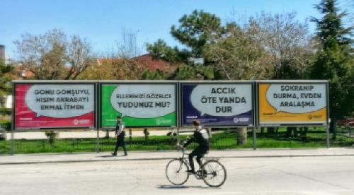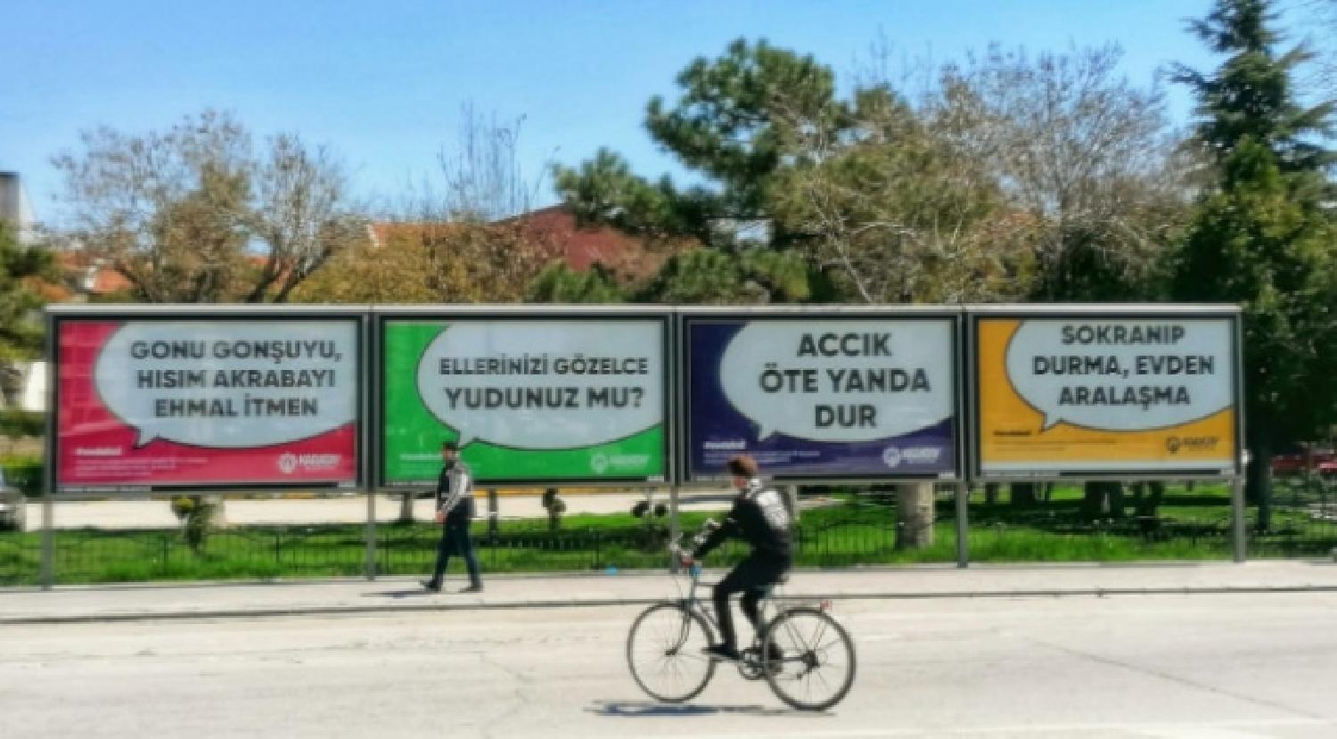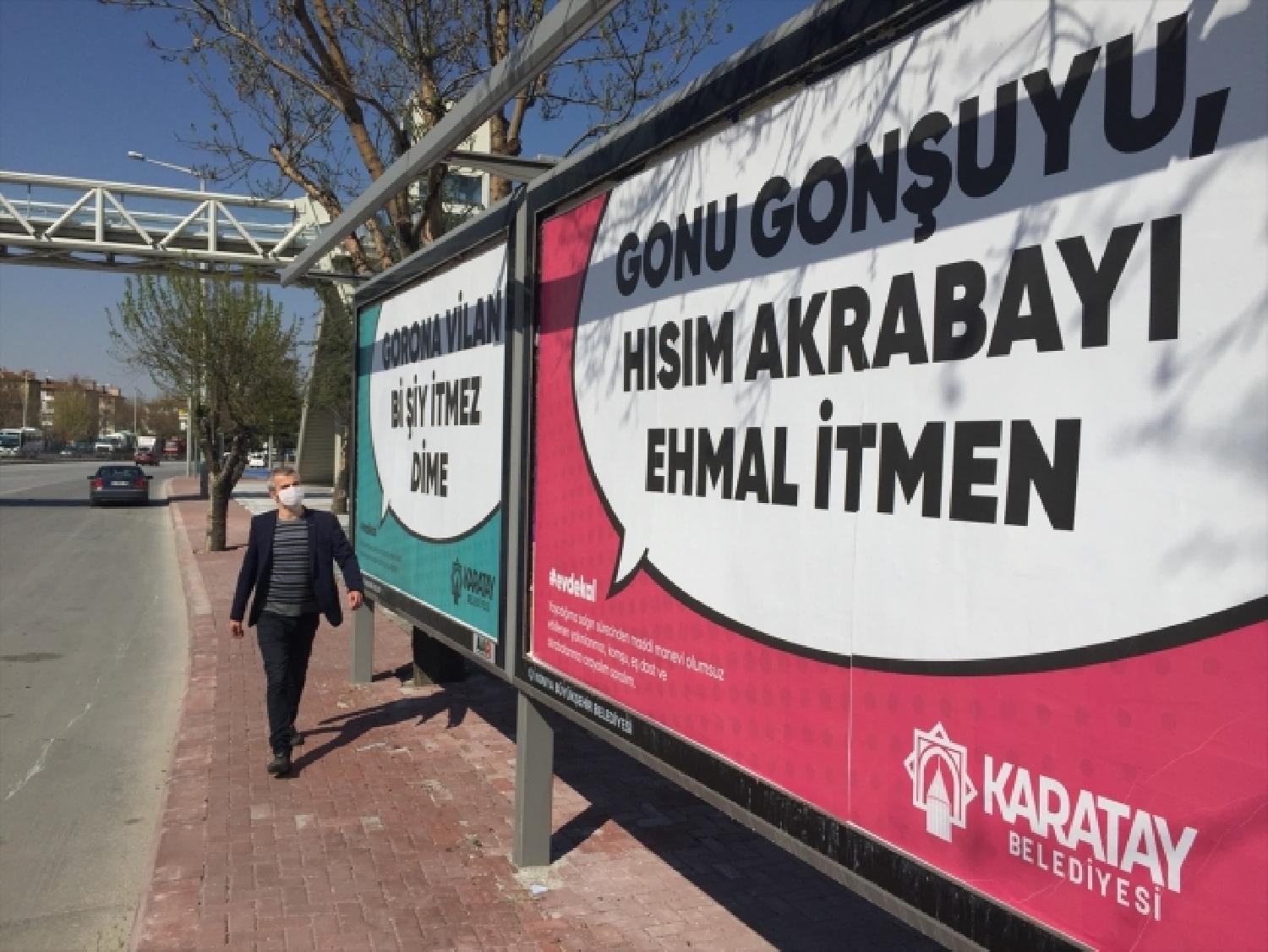 Virüsle mücadelede sosyal izolasyonun önemine dikkati çekmek için billboardlara ilan hazırlayan Karatay Belediyesi, Konya yöresinin ağız yapısına uygun, mizahi yönüyle de tebessüm ettiren sözleri derledi.