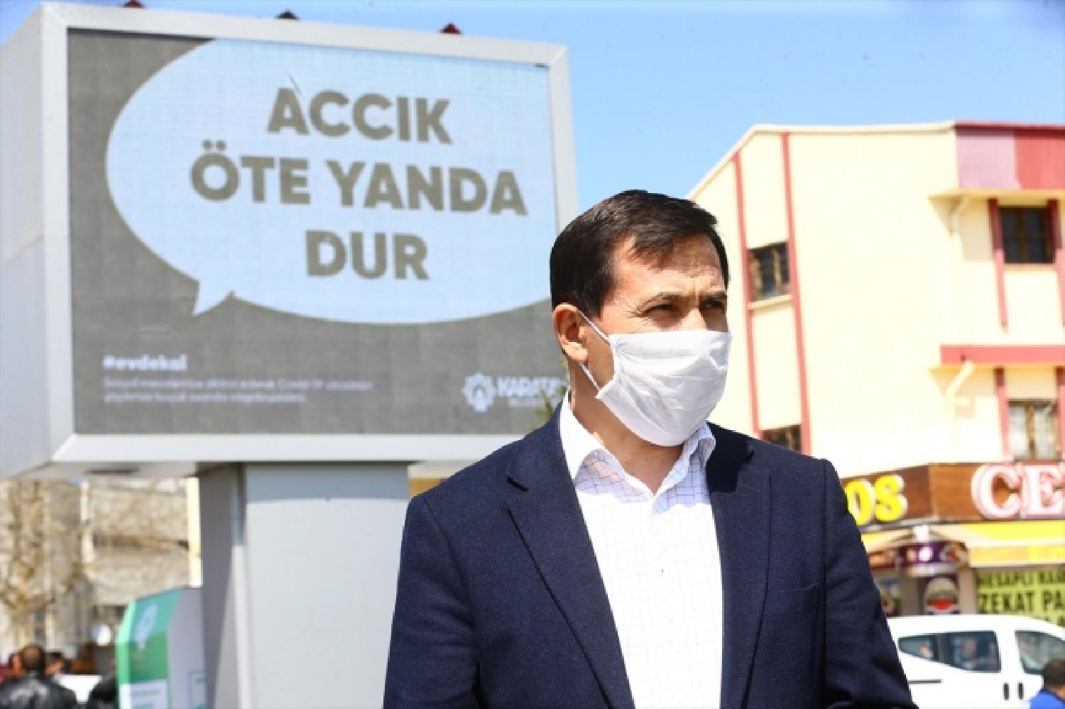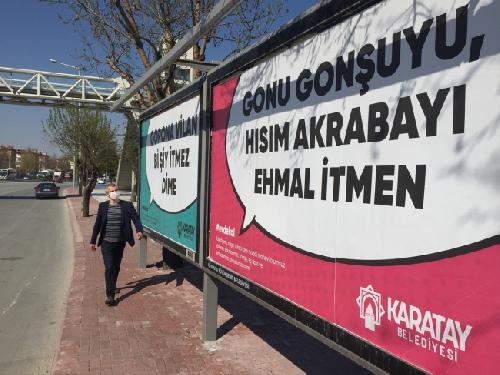 Karatay Belediyesi, yeni tip Koronavirüs’ün yayılmasının önlenmesi amacıyla vatandaşın uyması gereken kuralları yöresel şiveyle hatırlatıyor. Bu kapsamda Konyalıların evde kalması yönündeki çağrıları billboardlar vasıtasıyla sergiliyor.