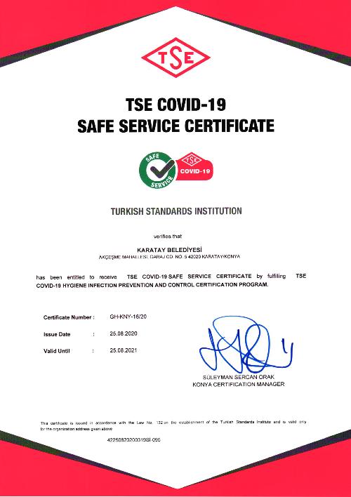 Karatay Belediyesi, Türk Standartları Enstitüsü(TSE) tarafından Hijyen, Enfeksiyon Önleme ve Kontrol Belgelendirme Programı şartlarını yerine getirerek Türkiye’de “TSE Covid-19 Güvenli Hizmet Belgesi” almaya hak kazanan ilk belediyelerden oldu.