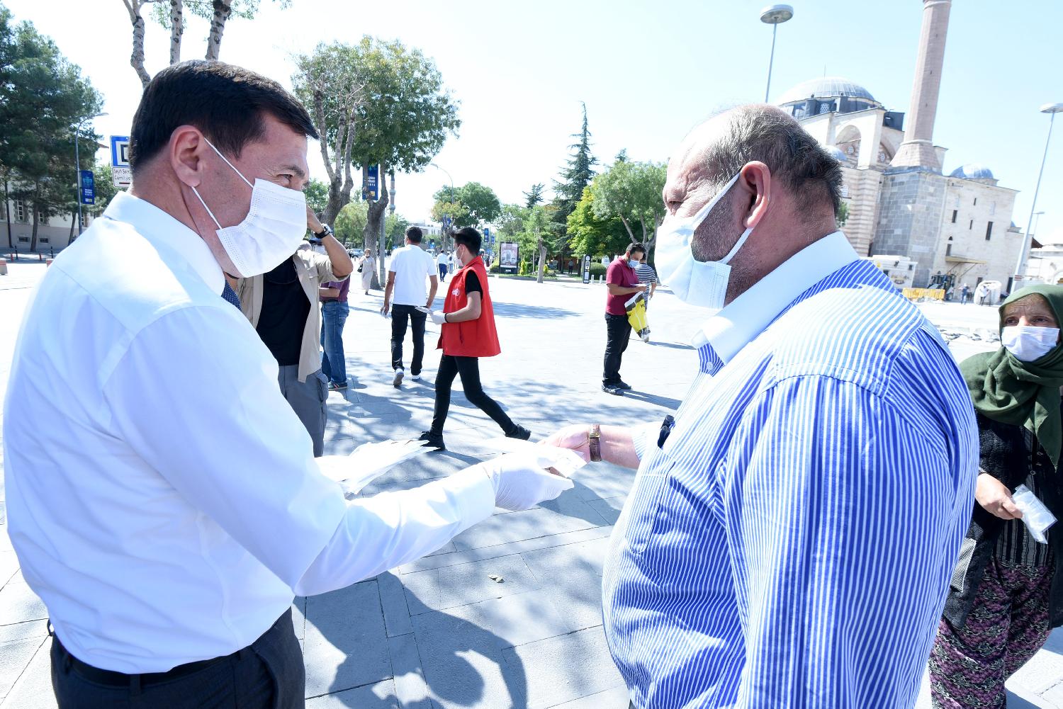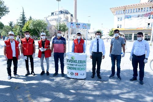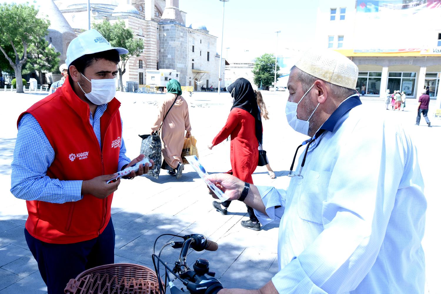 Konya Hükümet Meydanı, Mevlana Meydanı ve Karatay Belediyesi hizmet binası önlerine kurulan standlarda Karatay Kent Konseyi Başkanı Abdürrahim Arslan, Kent Konseyi Gençlik Meclisi Ahmet Babuççu ve konsey görevlileri, vatandaşlara hem bilgilendirici broşür hem de maske dağıtıyor.