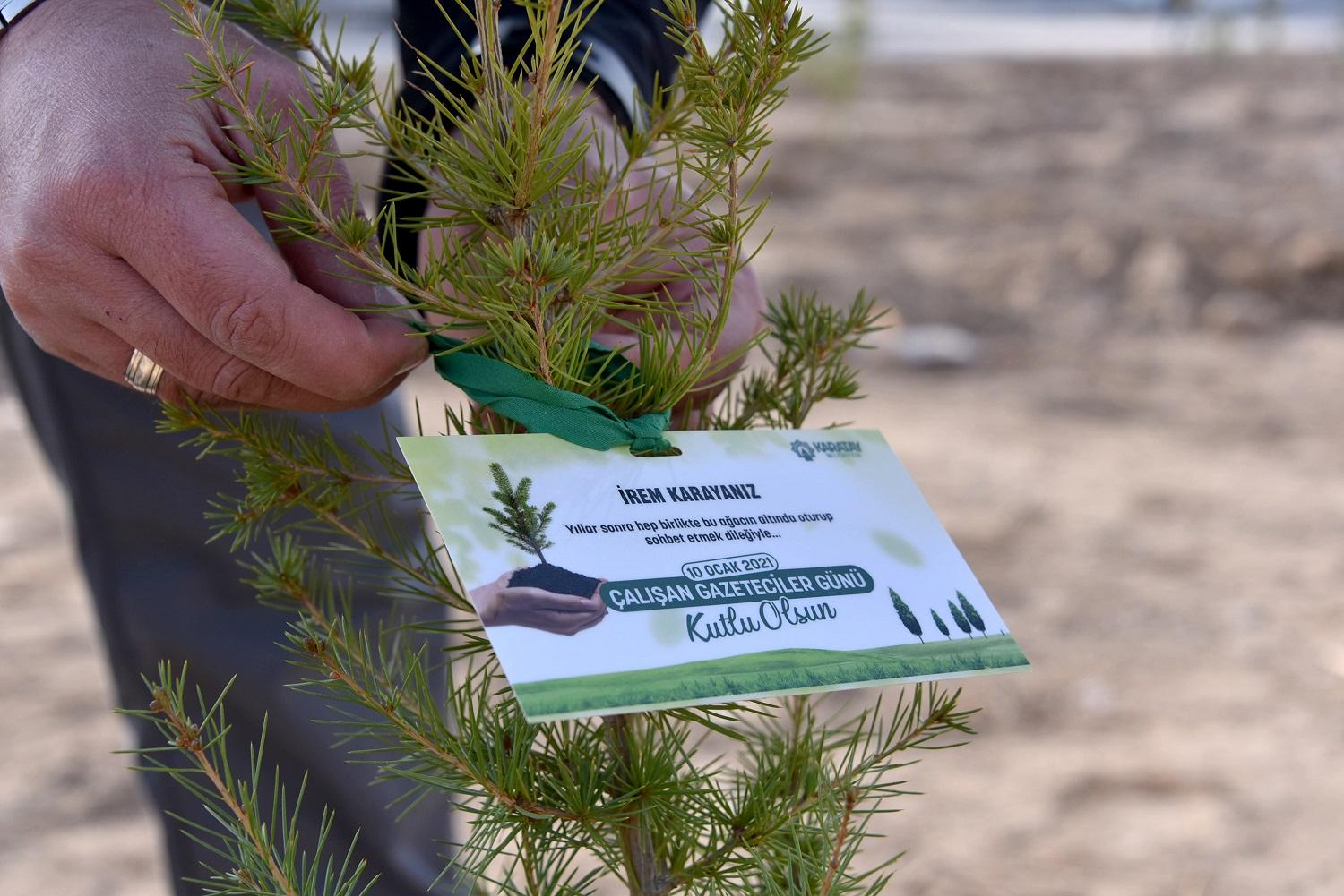 Konya’daki tüm basın-yayın kuruluşlarında görev yapan çalışanlar adına Fevzi Çakmak Mahallesi Medcezir Sokak’taki alanda dikilen fidanlara çalışanların isimlerinin yazılı olduğu levhalar da takıldı.