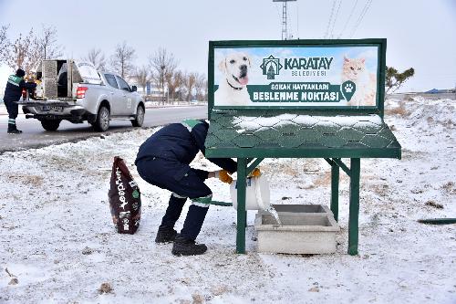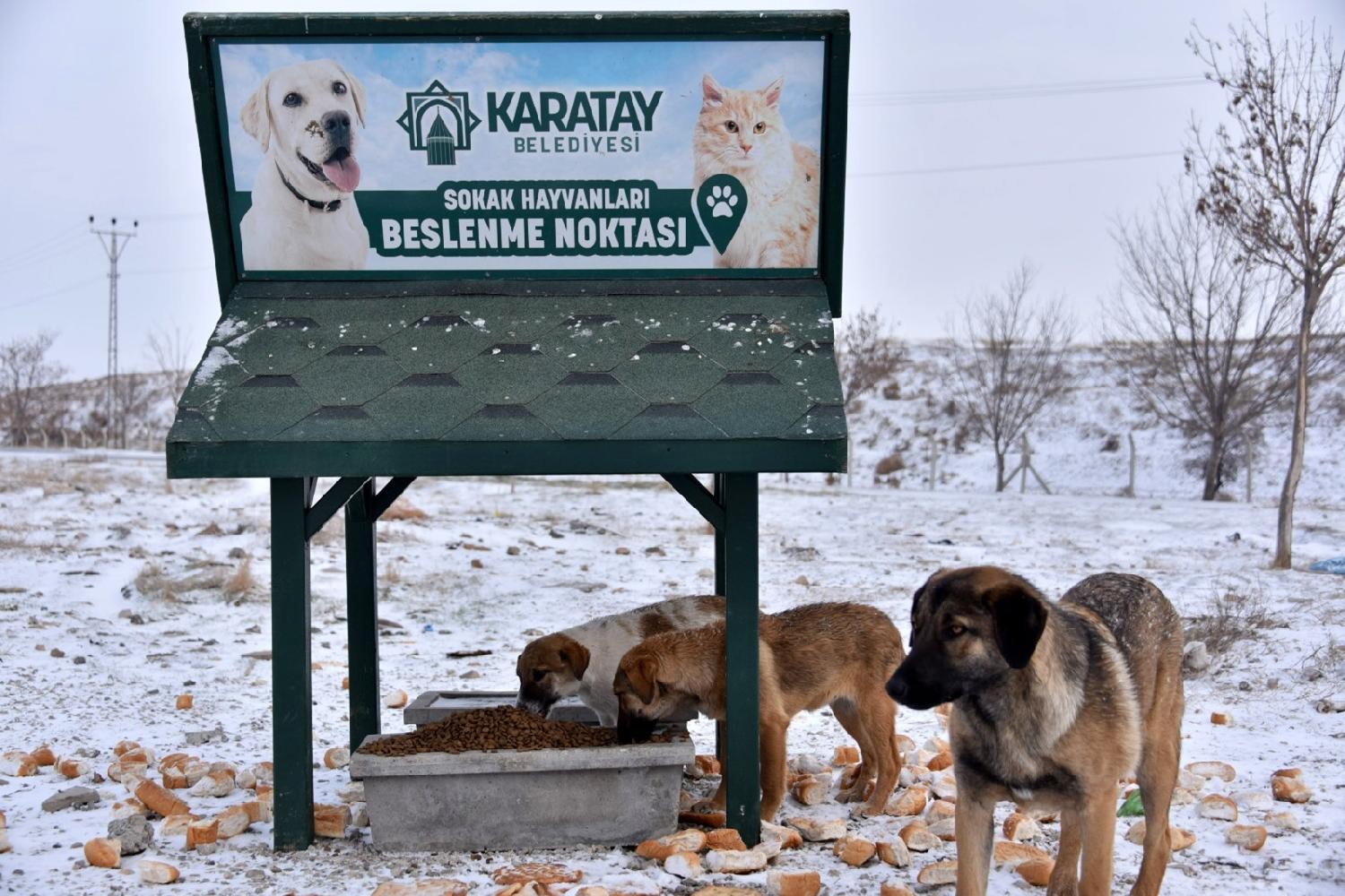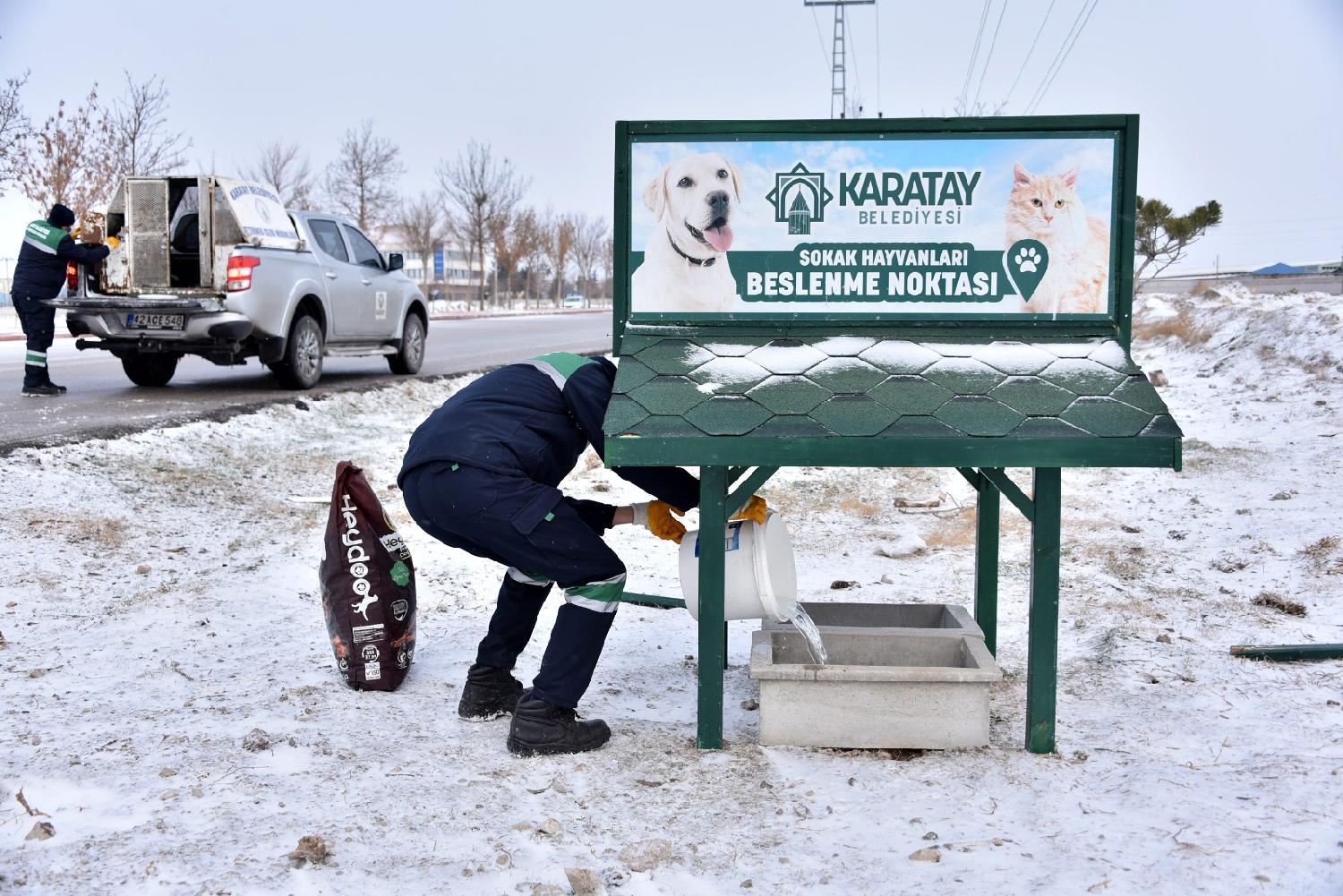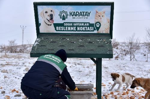 Karatay Belediyesi Veteriner İşleri Müdürlüğü ekipleri, kar yağışıyla birlikte yabani ve sokak hayvanlarının yaşamlarına devam edebilmesi için ilçenin birçok noktasına kurduğu kedi ve köpek besleme istasyonlarına yem bıraktı.