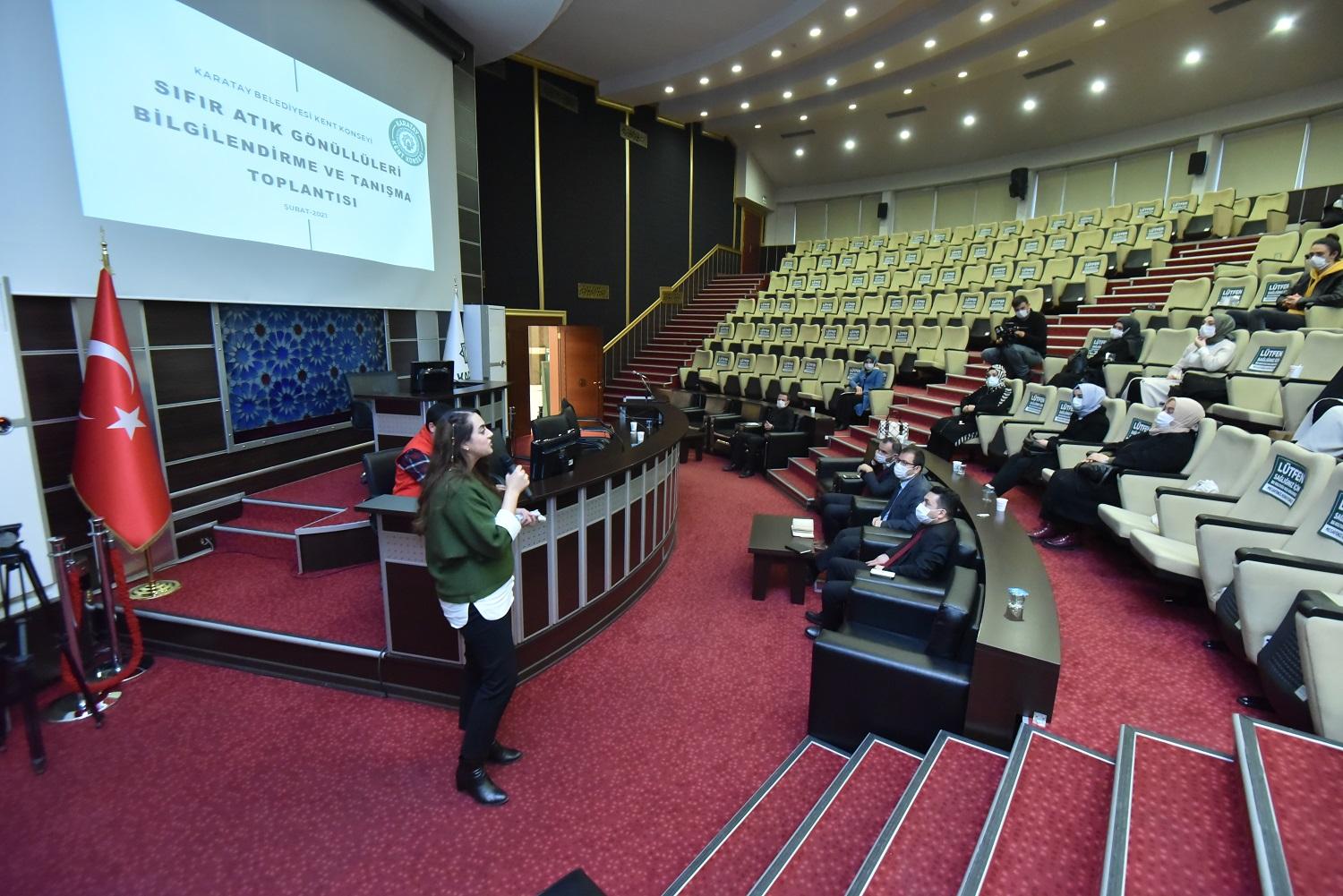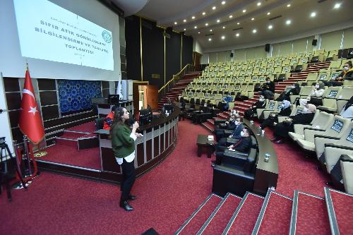 Karatay Belediye Başkan Yardımcısı Ramazan Şevik ile Çevre Koruma ve Kontrol Müdürlüğü Mühendisi Mustafa Çağrıkaya Karatay Belediyesi’nin Sıfır Atık alanında yürüttüğü çalışmaları içeren bir sunum yaparken, Karatay Kent Konseyi Sıfır Atık Çalışma Grubu Başkanı Ceren Çinikaya ise Kent Konseyi’nin projelerden bahsetti.