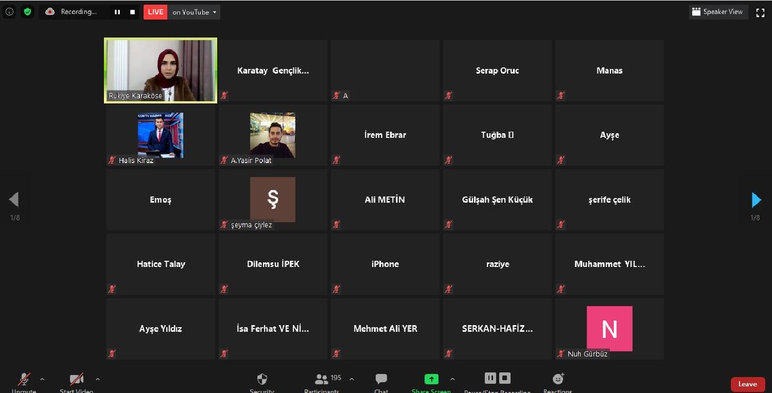 ‘Sağlıklı İletişim Mutlu Aile Okulu’ seminer dizisinin bu yıl pandemi nedeniyle çevrim içi eğitim olarak gerçekleştirilen ilk oturumunda Dr. Rukiye Karaköse, Evlilikte sorunlar, çözüm yolları ve sağlam bir evlilik için dikkat edilmesi gereken hususları anlattı.