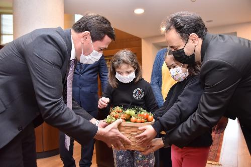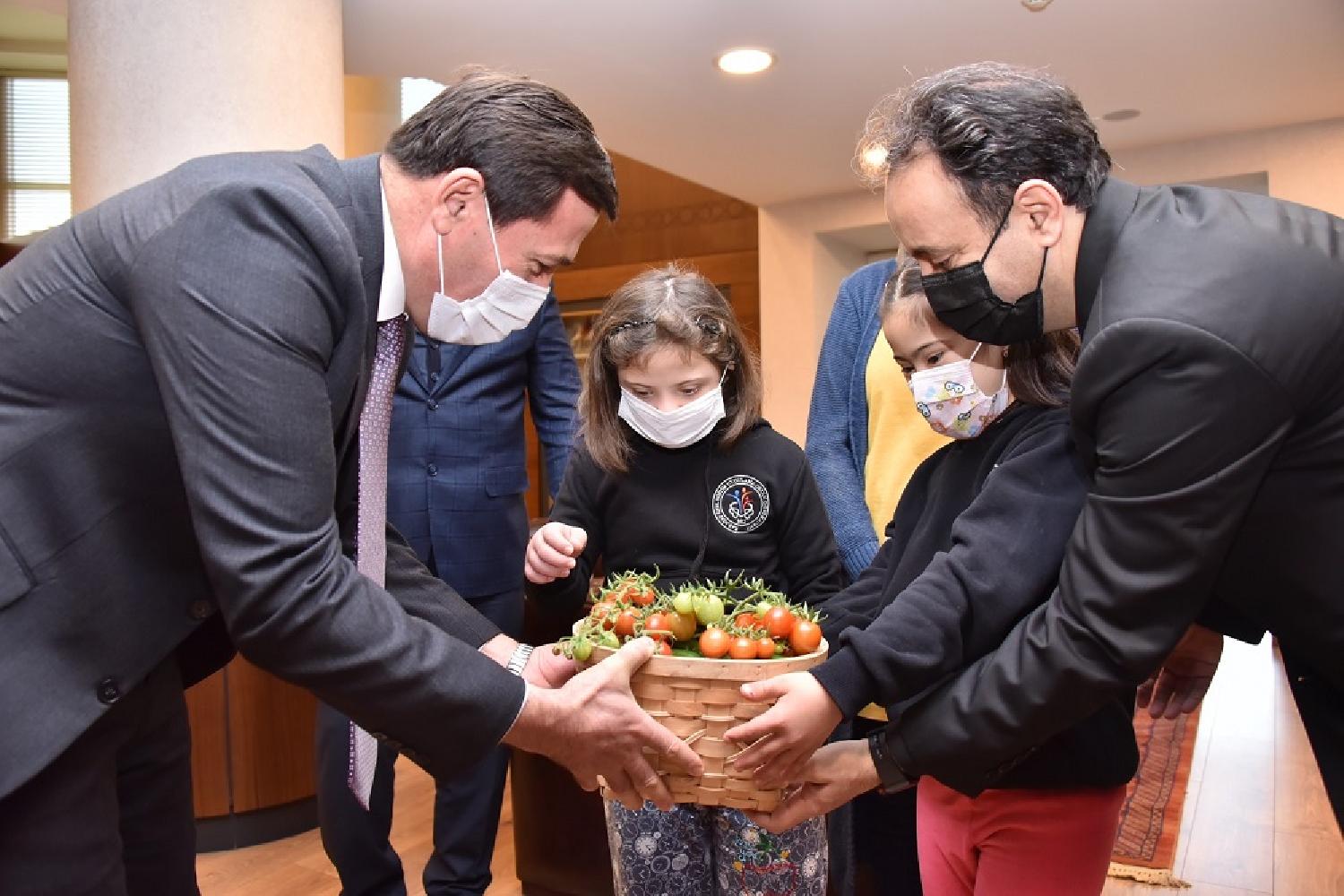 Özel öğrenciler, ziyarete elleri boş gelmedi. Karatay Belediyesi tarafından desteklenen sera projesinde kendi elleriyle yetiştirdikleri ürünlerle birlikte ziyarete gelen öğrenciler, bir süre Başkan Hasan Kılca ile görüştükten sonra ürünleri Hasan Kılca’ya hediye ederek destekleri için teşekkürlerini ilettiler.