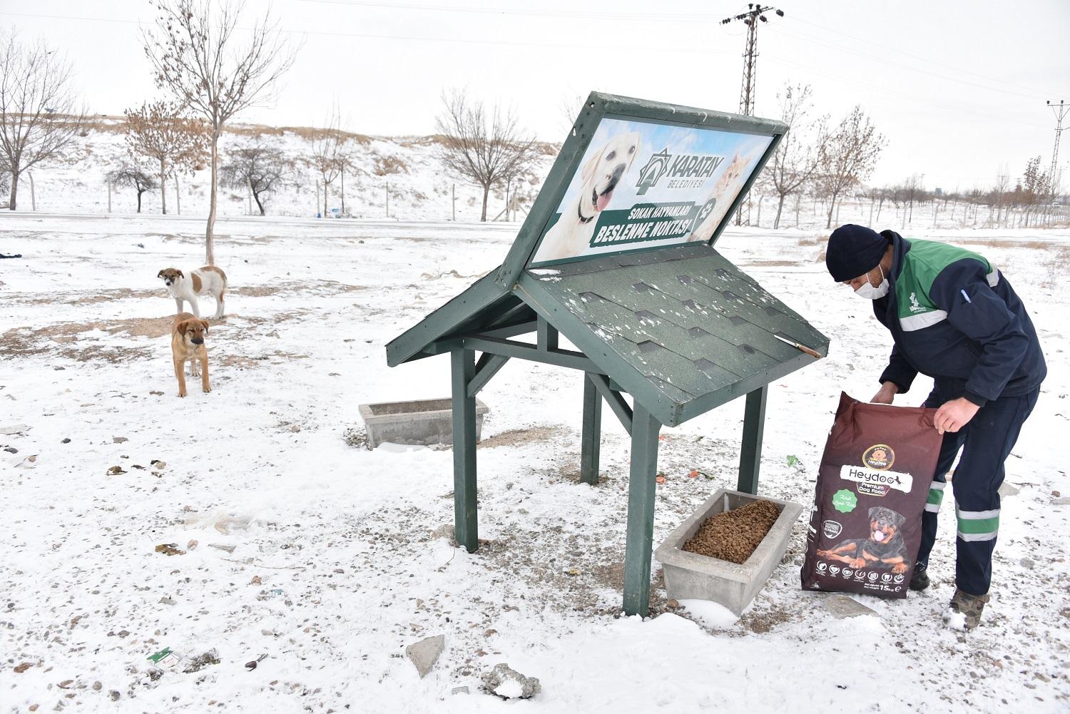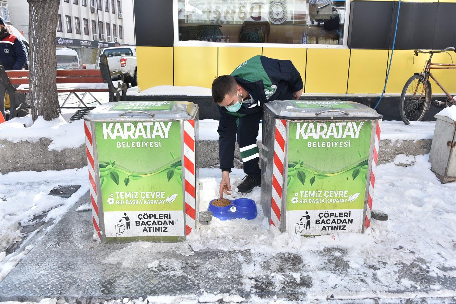 Karatay Belediyesi, kar yağışı ve soğuk hava sebebiyle yiyecek bulmakta zorlanan sokak hayvanlarını yine unutmadı.