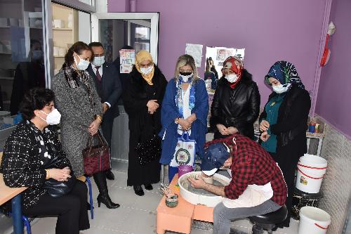 Özel öğrencilerle bir araya gelen protokol eşleri, okul faaliyetlerini yerinde gördü. Karatay Özel Eğitim Uygulama Okulu’ndaki iş uygulama atölyeleri, ahşap, müzik, kazanım, el sanatları, spor, sera ve seramik sınıfları ile birlikte toplantı salonlarını gezen protokol eşleri faaliyetlerle ilgili bilgi aldı.