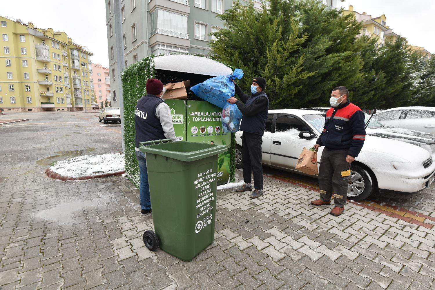 Karatay Belediyesi Çevre Koruma ve Kontrol Müdürlüğü ekipleri ile Sıfır Atık Çalışma Grubu Gönüllüleri, evleri tek tek ziyaret ederek bez çanta ve içerisinde sıfır atık konusunda bilgilendirici broşür, tohum kalem ve açacakla birlikte mavi toplama poşeti dağıtırken, site yönetimlerine ise atık toplama konteyneri, ağaç fidesi ve kafesler dağıtıyor.
