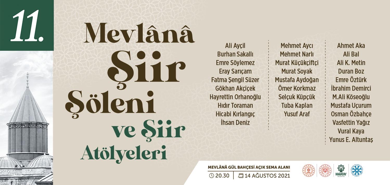 Karatay Belediyesi ve Türkiye Yazarlar Birliği Konya Şubesi'nin organize ettiği 11. Mevlânâ Şiir Şöleni 14 Ağustos Cumartesi günü Mevlânâ Gül Bahçesi’nde gerçekleştirilecek.