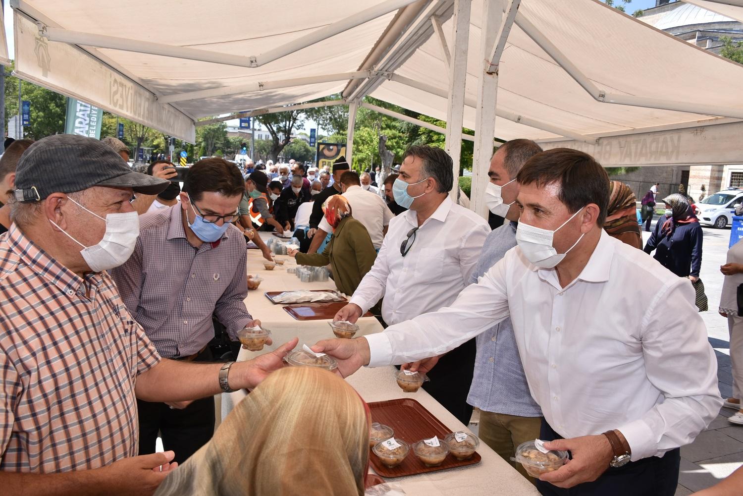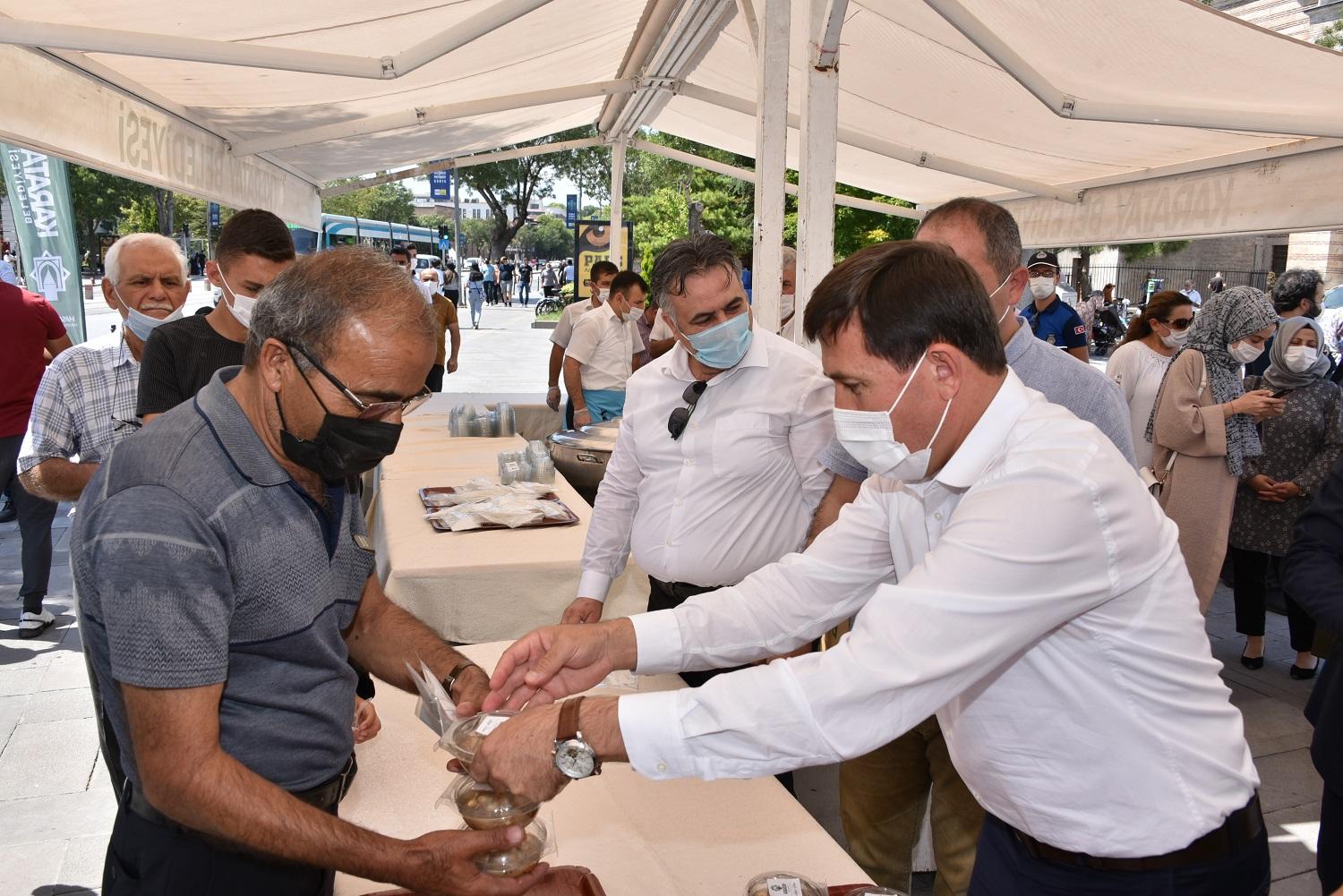 Kazanın başına geçen Karatay Belediye Başkanı Hasan Kılca da, kendi elleriyle vatandaşlara aşure ikram etti.