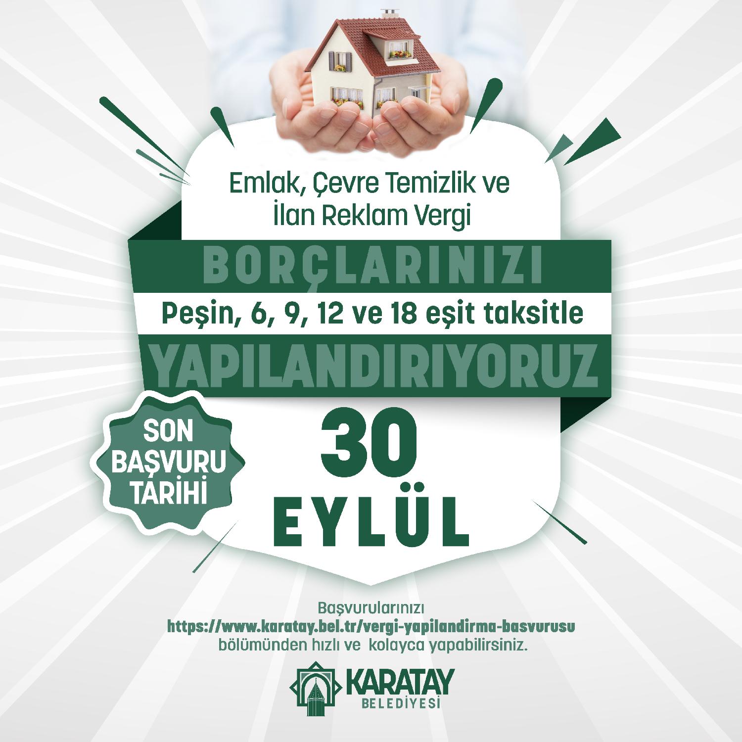 Karatay Belediyesi’nden yapılan açıklamada; Resmi Gazete’de yayımlanan Cumhurbaşkanı kararı doğrultusunda belediyeye ait vergi borç yapılandırma başvuru, bildirim ve beyan süreleri ile bu başvuru, bildirim ve beyana ilişkin ilk taksit ödeme sürelerinin birer ay uzatıldığı ifade edildi. Buna göre 31 Ağustos 2021 tarihinde bitecek yapılandırma için son başvuru tarihi 30 Eylül 2021 olarak yeniden belirlenirken; yapılandırma başvurusu sonrasında ilk taksit ödeme süresi de yine bir ay ertelenerek 1 Kasım 2021’den 1 Aralık 2021’e uzatıldı.