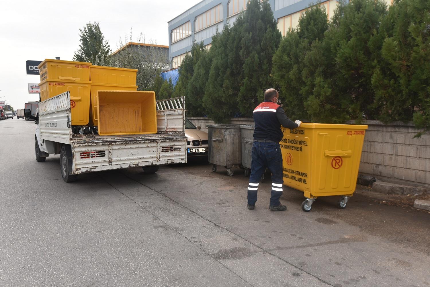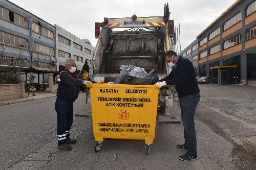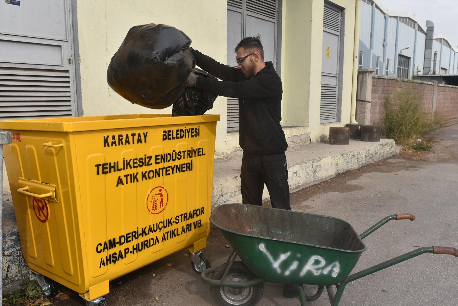 Karatay Belediyesi Çevre Koruma ve Kontrol Müdürlüğü Sıfır Atık ekipleri de ilçedeki sanayicileri Sıfır Atık konusunda bilgilendirerek sanayicilere sarı renkte tehlikesiz endüstriyel atık konteyneri dağıttı. Sanayiciler, sarı renkteki söz konusu konteynerlere cam, deri, kauçuk, strafor, ahşap, hurda atıkları gibi ekonomik değeri olmayan atıkları biriktirecek; böylece ekonomik değeri bulunan evsel nitelikli atıklarla karışması önlenerek geri dönüşümünün kolaylaşması sağlanmış olacak.