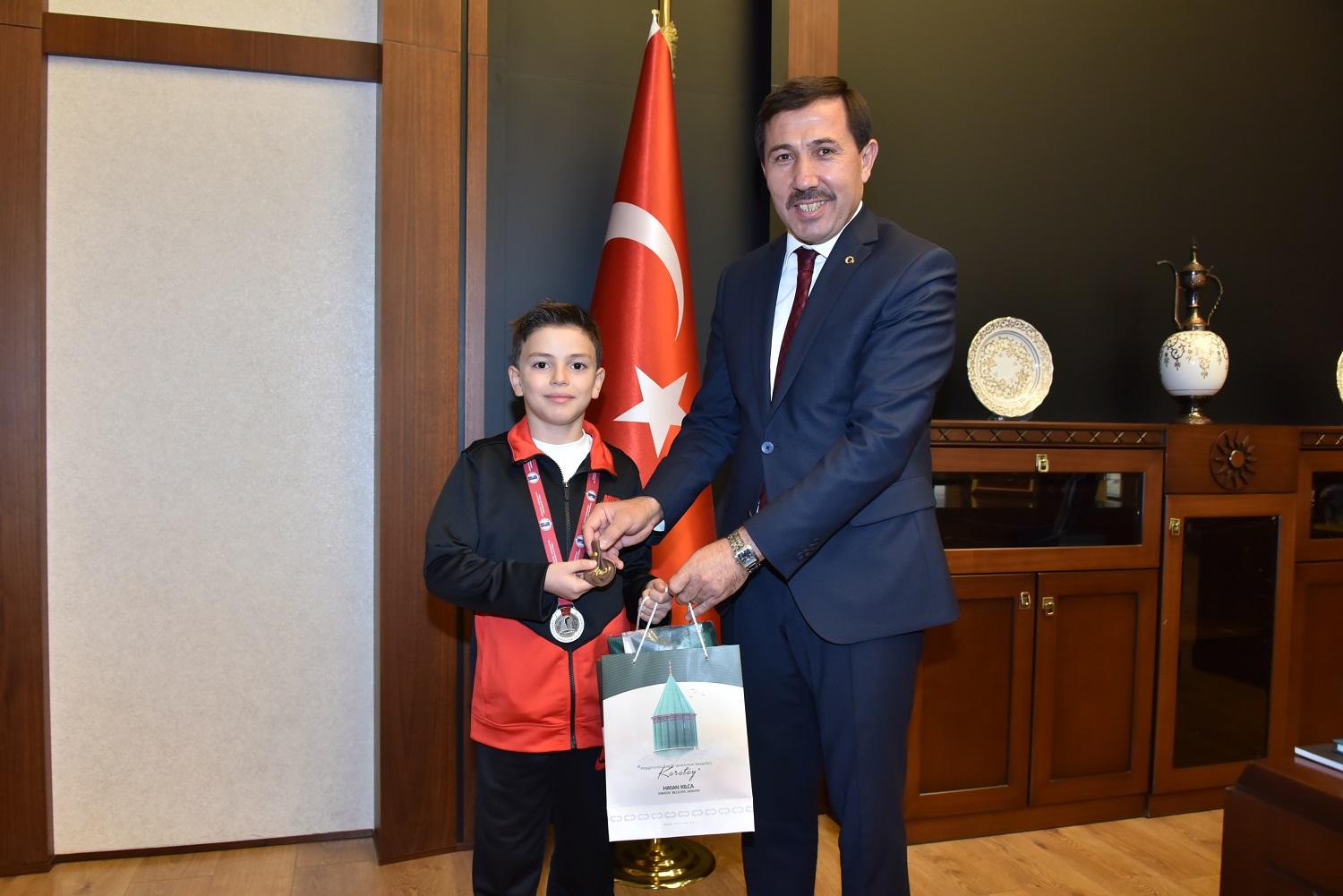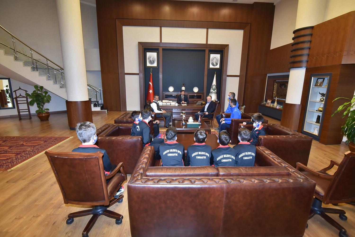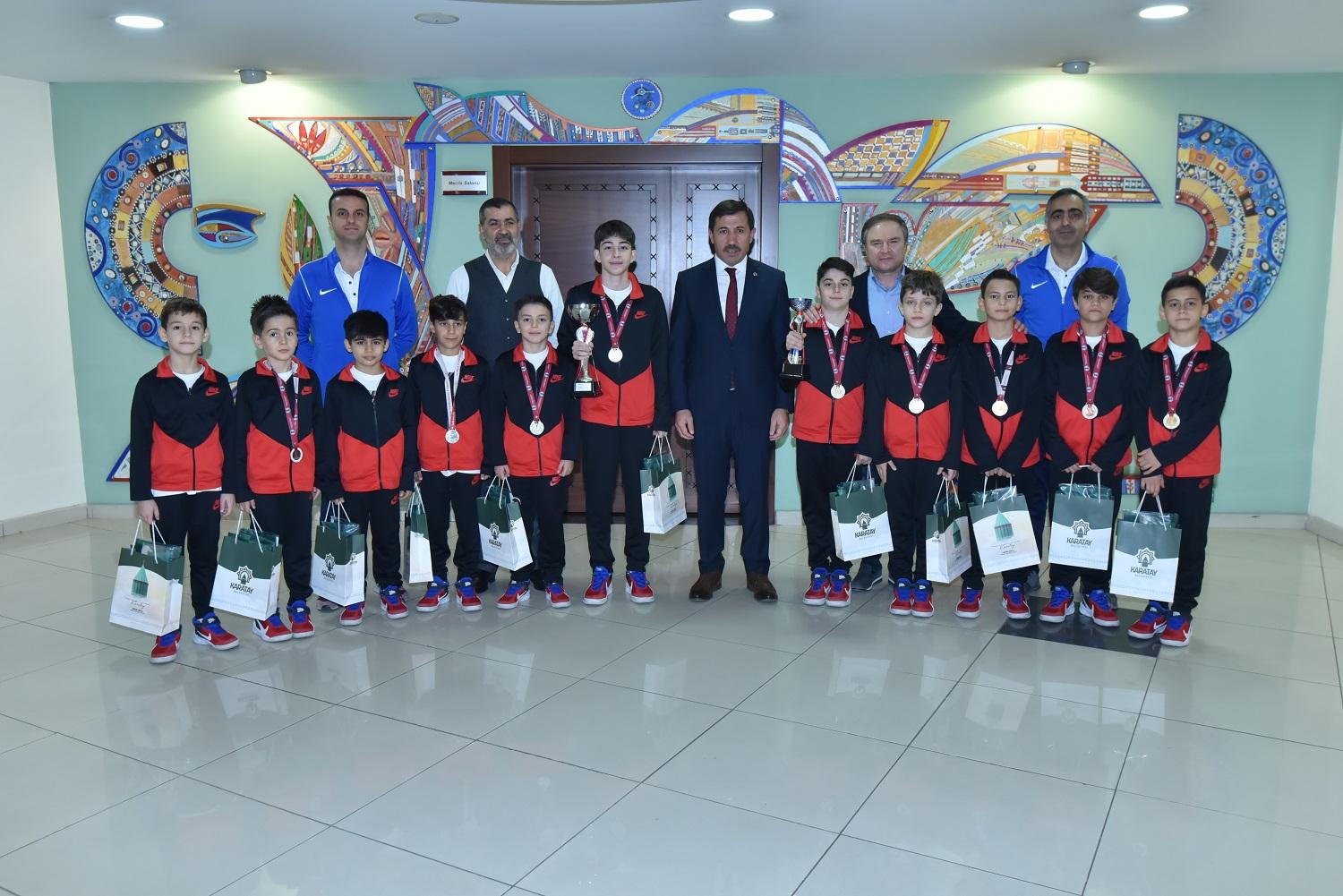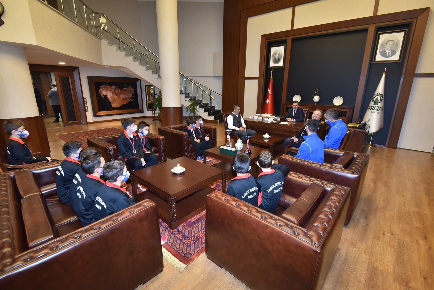 Karatay Belediyespor Kulübü şampiyonları, Karatay Belediye Başkanı Hasan Kılca’yı ziyaretlerinde desteklerinden dolayı Başkan Hasan Kılca’ya teşekkür ettiler.