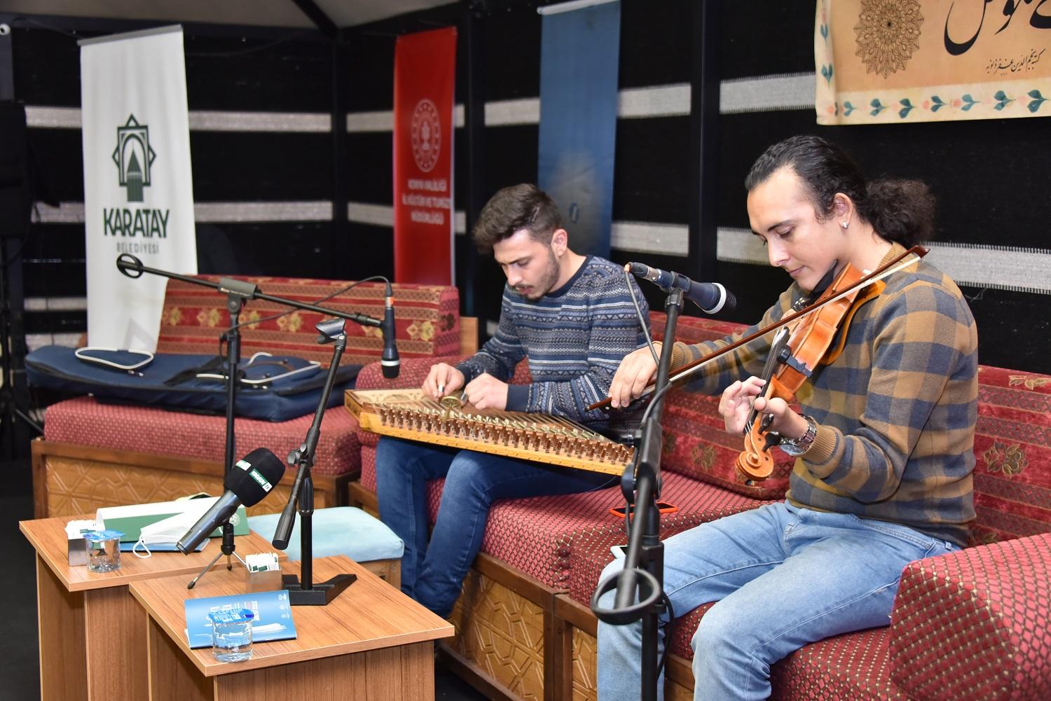 Selçuk Üniversitesi Dilek Sabancı Devlet Konservatuvarı öğrencilerinden oluşan bir diğer topluluk ise musiki ve şiir dinletisiyle çadırı dolduran misafirlere güzel bir gün yaşattı. Öte yandan söz konusu müzik toplulukları, Mevlana Meydanı’nda kurulan çadırda 17 Aralık’a kadar konserlerini sürdürecek.