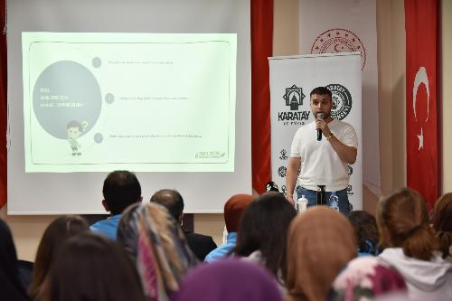Melike Hatun Kız Öğrenci Yurdunda gerçekleştirilen programda ilk olarak Karatay Belediyesi’nin sıfır atık konusunda yaptığı çalışmalar hakkında öğrencilere sunum yapan Karatay Kent Konseyi Sıfır Atık Çalışma Grubu Gönüllüsü Çevre Mühendisi Mücahit Bulut; plastik, metal, kompozit, kağıt ürünleri, cam gibi geri dönüştürülerek ekonomiye kazandırılabilecek atıkların sıfır atık uygulamaları, oluşan atıkların ayrıştırılarak yeniden kullanılmasının önemi ve bireylerin üzerine düşen sorumlulukları öğrencilerle paylaştı.