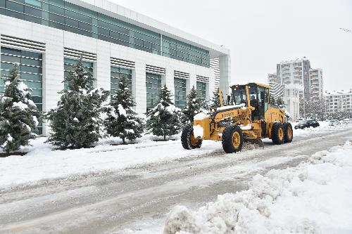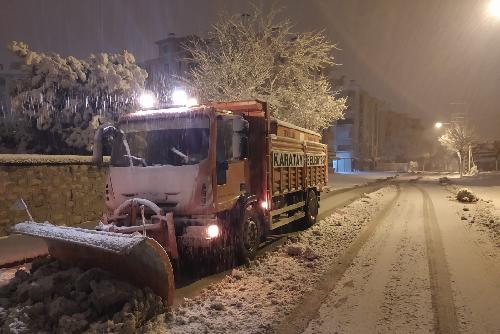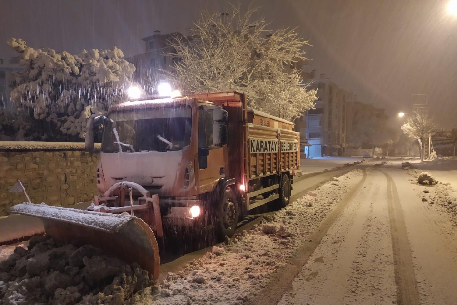 Konya genelinde gece saatlerinden itibaren başlayan yoğun kar yağışı ile birlikte Karatay Belediyesi, tüm ekipleriyle birlikte adeta teyakkuza geçti.