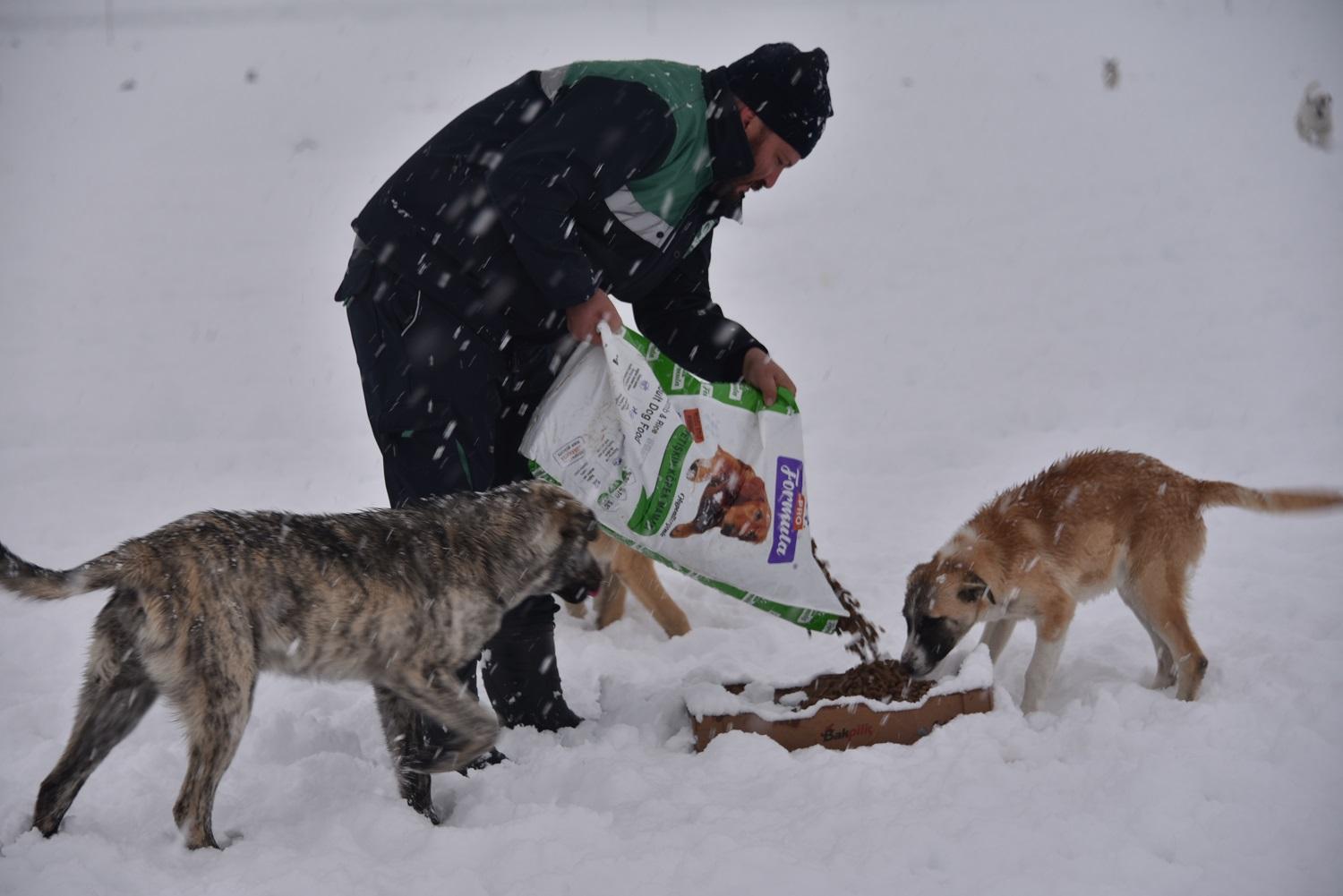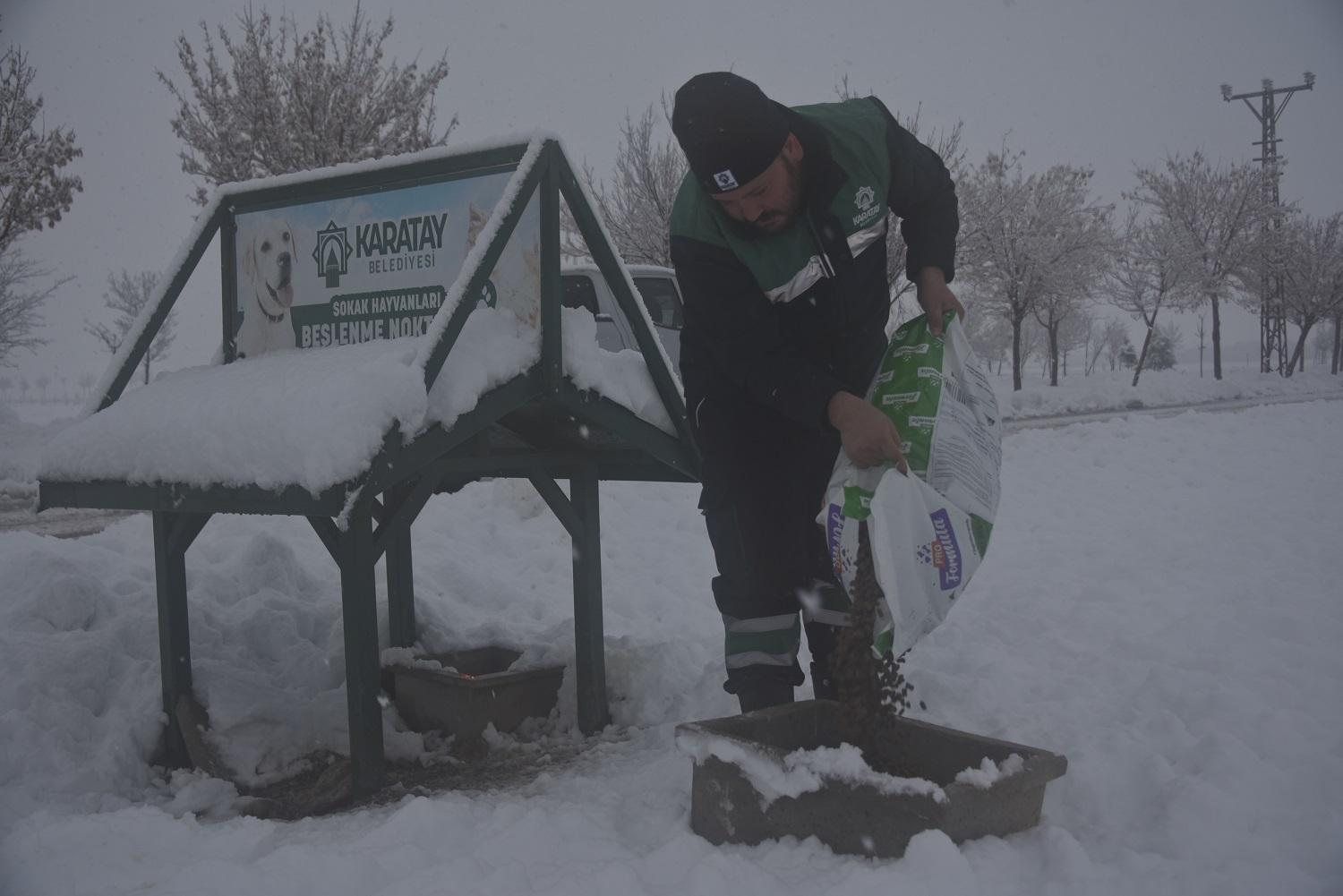 Karatay Belediyesi, yoğun kar yağışı ve aşırı soğuklar nedeniyle yiyecek bulmakta zorlanan sokak hayvanlarını unutmadı.
