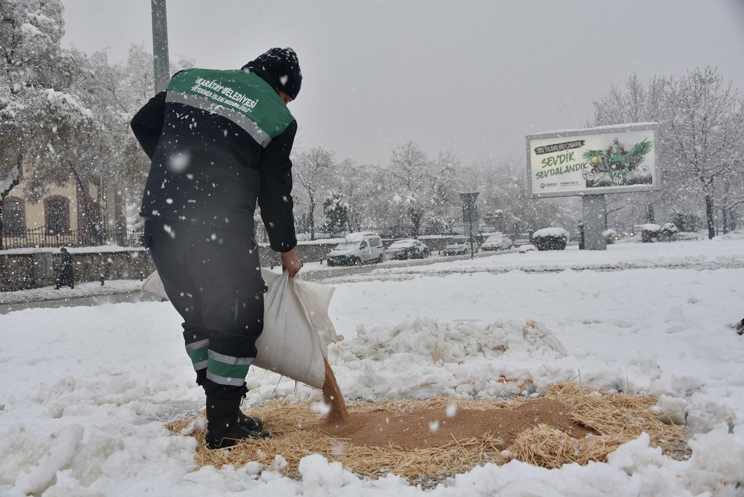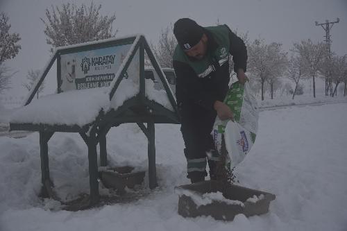 Karatay Belediyesi Veteriner İşleri Müdürlüğü ekipleri, kar yağışının başlamasıyla birlikte rutin olarak yürüttüğü çalışmalarına yoğunluk vererek, belediye tarafından ilçenin çeşitli noktalarına yerleştirilen köpek ve kedi besleme istasyonları ile kuş evleri ve yine açık alanlara yem bıraktı.