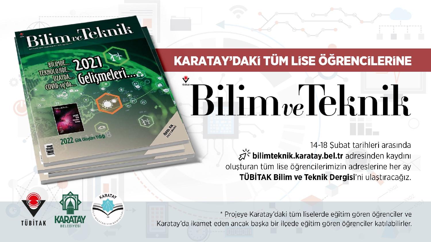 Bu kapsamda lise öğrencilerin TÜBİTAK Bilim ve Teknik Dergisi’ni alabilmeleri için 18 Şubat’a kadar bilimteknik.karatay.bel.tr adresinden kaydını oluşturması gerekiyor. Projeye Karatay’daki tüm liselerde eğitim gören öğrenciler ve Karatay’da ikamet eden ancak başka bir ilçede eğitim gören öğrenciler de katılabilecek.