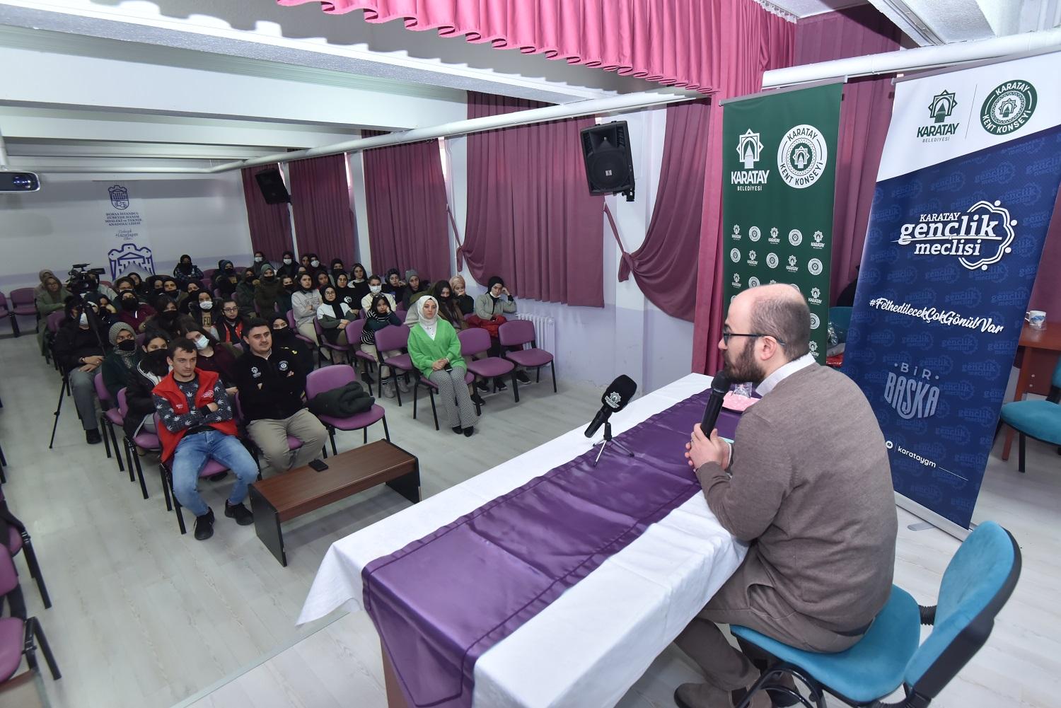 Karatay Belediyesi Kent Konseyi Gençlik Meclisi, ilçede eğitim gören öğrencilere yönelik eğitim ve kariyer planlaması için önemli bir projeyi hayata geçirdi. Özellikle lise öğrencilerinin meslek, staj yeri ve üniversitedeki bölümün seçimine katkı sunacak programların ilki ise Karatay Borsa İstanbul Zübeyde Hanım Mesleki ve Teknik Anadolu Lisesi’nde yapıldı. Programa konuşmacı olarak katılan Necmettin Erbakan Üniversitesi Turizm Fakültesi Dekan Yardımcısı Dr. Mustafa Cüneyt Şapcılar, akademik kariyer ve dil eğitiminin önemine vurgu yaptı.